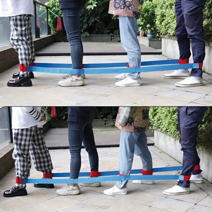 Die Handhabung ist dabei denkbar einfach und schnell. Dank des praktischen Klettverschlusses lassen sich die robusten Schlaufen im Handumdrehen an den Beinen der Kinder befestigen und individuell anpassen, um einen optimalen und sicheren Sitz zu gewährleisten. Sobald die Gruppe miteinander verbunden ist, beginnt die eigentliche Herausforderung: Es muss ein gemeinsamer Rhythmus gefunden, Kommandos müssen gegeben und Bewegungen aufeinander abgestimmt werden. Was als lustiges Stolpern beginnt, entwickelt sich schnell zu einem faszinierenden Prozess, bei dem Kinder lernen, dass man gemeinsam mehr erreicht.