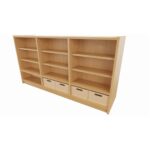 Dieser Korpus-Classic Raumteilerschrank überzeugt durch seine durchdachte Aufteilung, die eine optimale Nutzung des Stauraums ermöglicht. Die Vorderseite bietet Regaleinheiten und eine kleine Doppeltür, die zusätzlichen geschützten Stauraum bieten. Die Rückseite ist mit drei Regalen ausgestattet, die jeweils zwei Einlegeböden haben. Die sechs Materialkästen können bequem von beiden Seiten herausgezogen werden, was diese Lösung besonders flexibel und praktisch macht. Hergestellt aus hochwertigen und langlebigen Materialien, sorgt dieser Schrank für hohe Strapazierfähigkeit und Langlebigkeit – ideal für den intensiven Einsatz im Kindergarten- und Schulalltag.