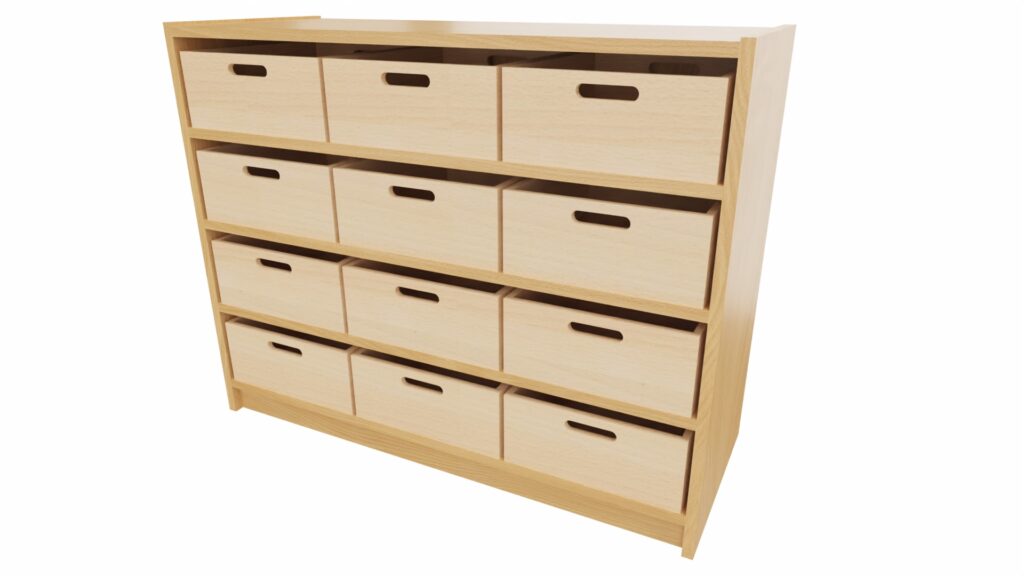 Bringen Sie mehr Ordnung und Übersicht in Ihre Räume mit unserem Korpus-Classic Unterschrank, ausgestattet mit 12 Materialkästen und 3 festen Böden. Dieser vielseitige und robuste Unterschrank ist perfekt geeignet für Kindergärten und Grundschulen und bietet ideale Lösungen zur Aufbewahrung von Lernmaterialien, Spielzeug und Bastelutensilien.
