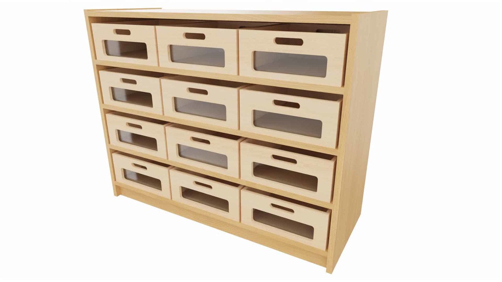 - Zwei Varianten: 12 geschlossene Materialkästen / 12 Materialkästen mit Acrylglasfront, jeweils mit 3 festen Böden