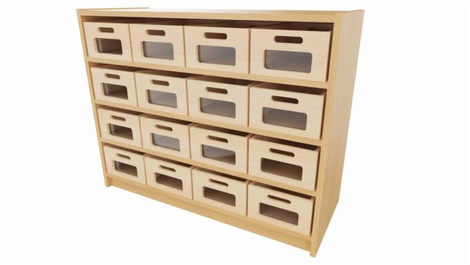 - Zwei Varianten: 16 geschlossene Materialkästen / 16 Materialkästen mit Acrylglasfront, jeweils mit 3 festen Böden