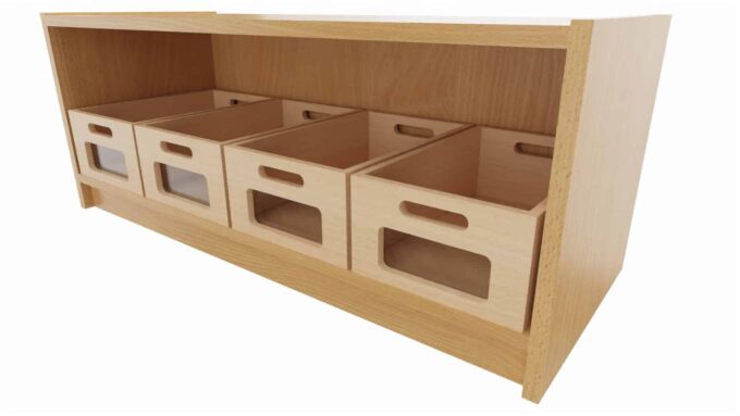 Der Korpus-Classic Unterschrank bietet durch seine vier großzügigen Materialkästen eine optimale Lösung für die Aufbewahrung von Lernmaterialien, Spielzeug und Bastelutensilien. Die Variante mit Acrylglasfront ermöglicht es, den Inhalt der Kästen jederzeit sichtbar zu halten, was die Organisation noch einfacher macht. Die robusten Kästen sind leicht zugänglich und fördern die Selbstständigkeit der Kinder.