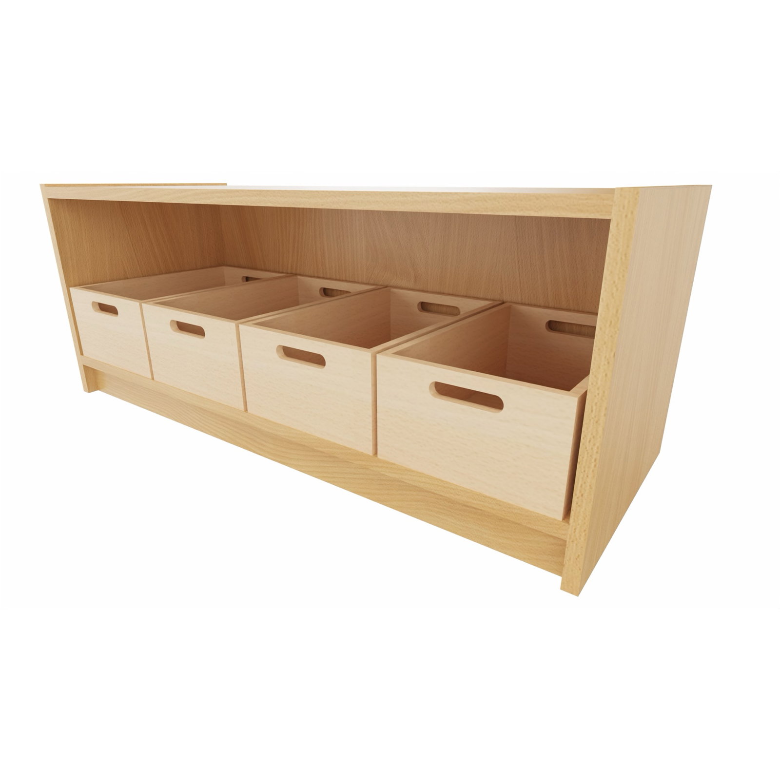 Der Korpus-Classic Unterschrank bietet durch seine vier großzügigen Materialkästen eine optimale Lösung für die Aufbewahrung von Lernmaterialien, Spielzeug und Bastelutensilien. Die Variante mit Acrylglasfront ermöglicht es, den Inhalt der Kästen jederzeit sichtbar zu halten, was die Organisation noch einfacher macht. Die robusten Kästen sind leicht zugänglich und fördern die Selbstständigkeit der Kinder.