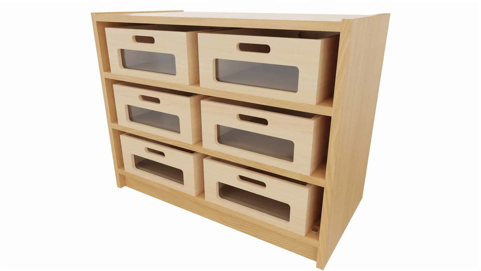 - Zwei Varianten: 6 Materialkästen (geschlossen) / 6 Materialkästen mit Acrylglasfront, jeweils mit 2 festen Böden