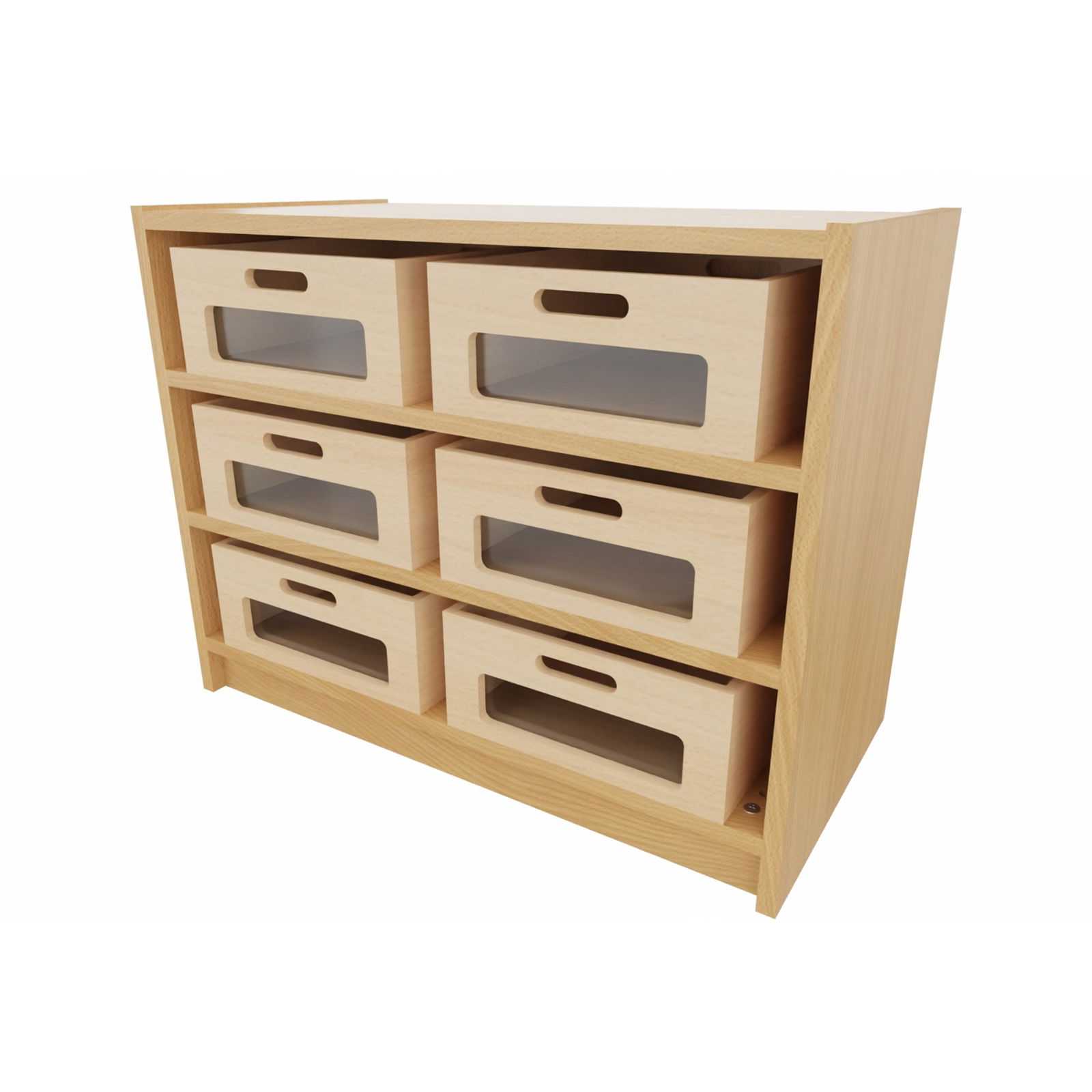 Unser Korpus-Classic Unterschrank bietet eine effiziente Aufbewahrungslösung für Lernmaterialien, Spielzeug und Bastelutensilien. Die sechs Materialkästen ermöglichen eine übersichtliche und leicht zugängliche Organisation, während die festen Böden zusätzliche Stabilität bieten. Die Variante mit Acrylglasfront erlaubt es, den Inhalt der Kästen jederzeit sichtbar zu halten.