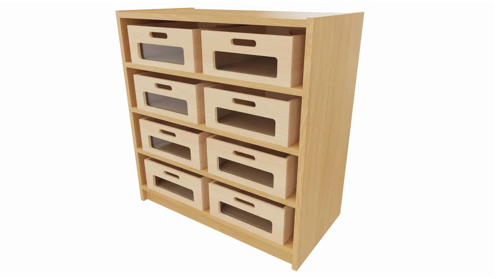 - Zwei Varianten: 8 Materialkästen (geschlossen) / 8 Materialkästen mit Acrylglasfront, jeweils mit 3 festen Böden