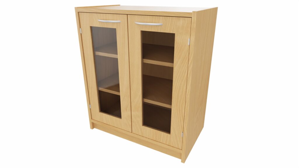 Unser Korpus-Classic Unterschrank mit Doppeltür und Glasfüllung bietet eine stilvolle und praktische Aufbewahrungslösung für Kindergärten, Kitas und andere pädagogische Einrichtungen. Mit einer Breite von 69 cm und verschiedenen Einlegeböden passt sich dieser Unterschrank ideal an Ihre Bedürfnisse an.