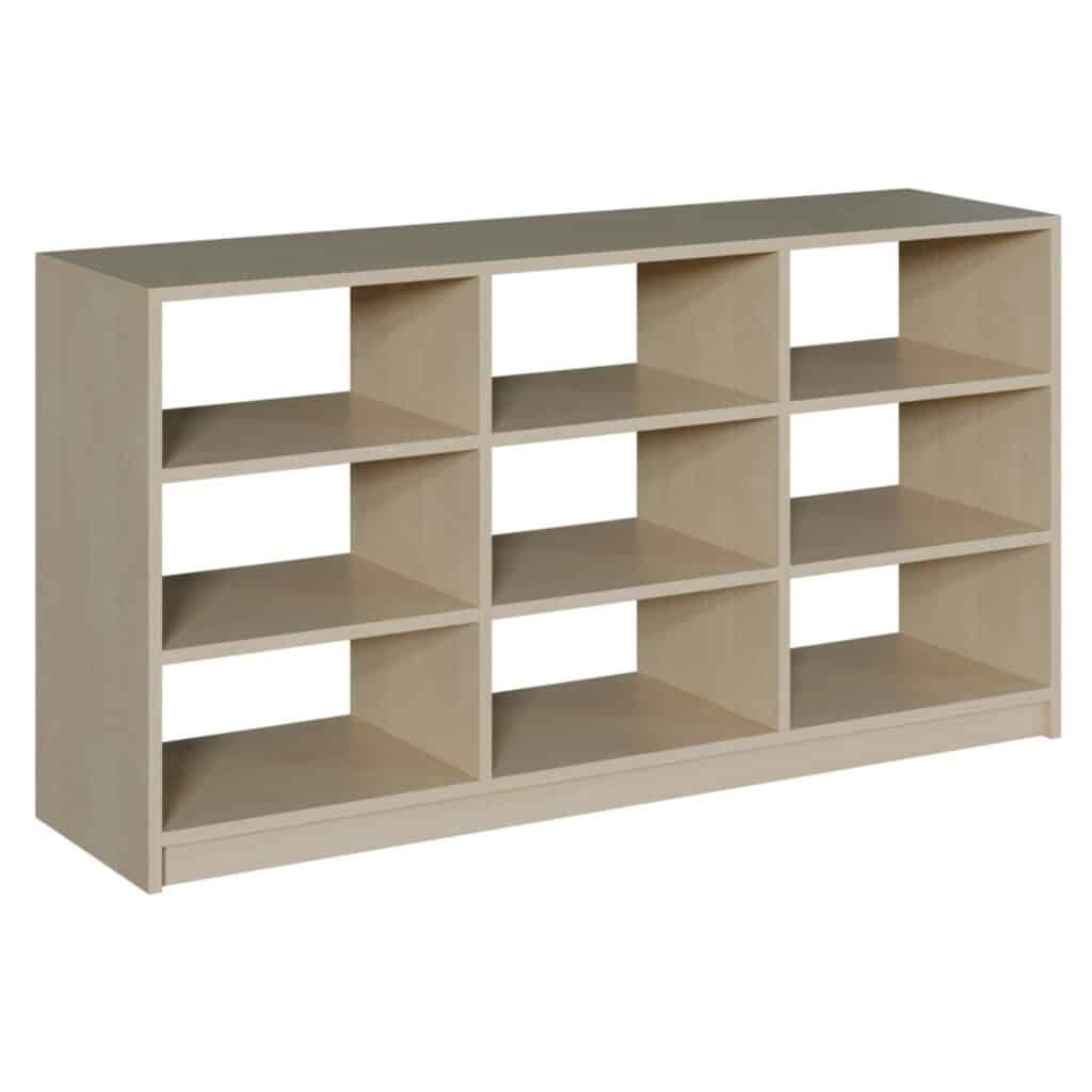 - Neun geräumige Fächer: Die symmetrische Aufteilung schafft neun Fächer mit großzügigen Abmessungen, die sich ideal für die Aufbewahrung von großen Bilderbüchern, Spielkisten, Bausteinen und thematischen Materialien eignen.