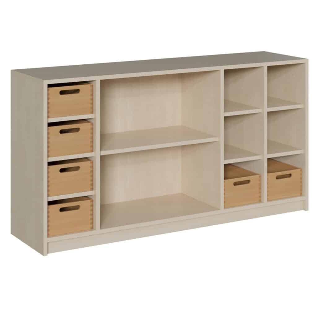 - Beidseitig nutzbar: Der Schrank ist so konzipiert, dass er von beiden Seiten aus zugänglich und attraktiv ist. Frei im Raum platziert, wird er zum kommunikativen Mittelpunkt, an dem mehrere Kinder gleichzeitig agieren und auf Materialien zugreifen können.