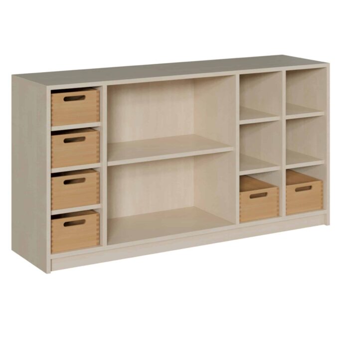 - Offenheit und Struktur: Dieses Regal teilt Räume, ohne sie zu verschließen. Es schafft klar definierte Zonen für Spiel, Lernen oder Entspannung, während der helle und offene Charakter des Raumes erhalten bleibt. Ideal für moderne pädagogische Konzepte.