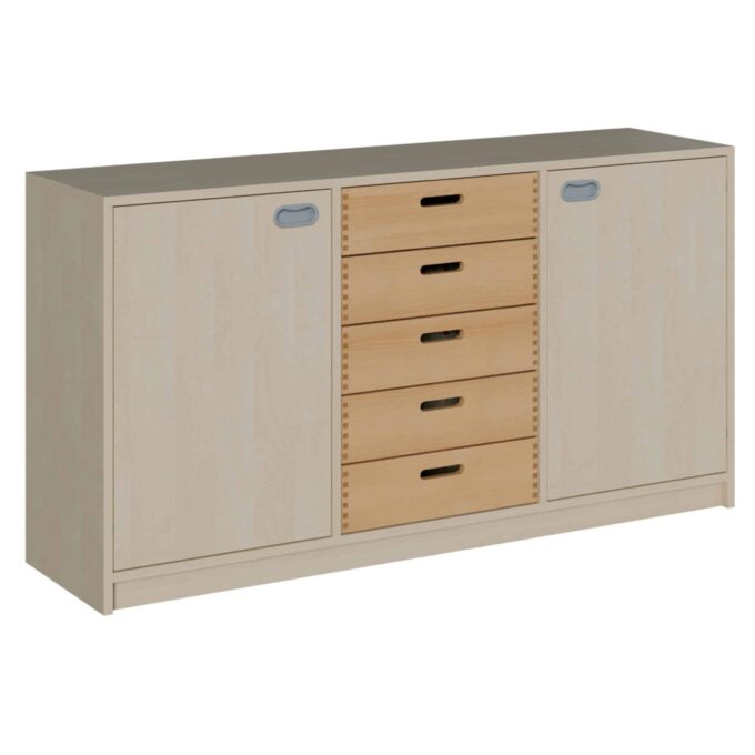 - Besonderheit: Symmetrische Aufteilung mit 2 Türen und 5 zentralen Holzschüben