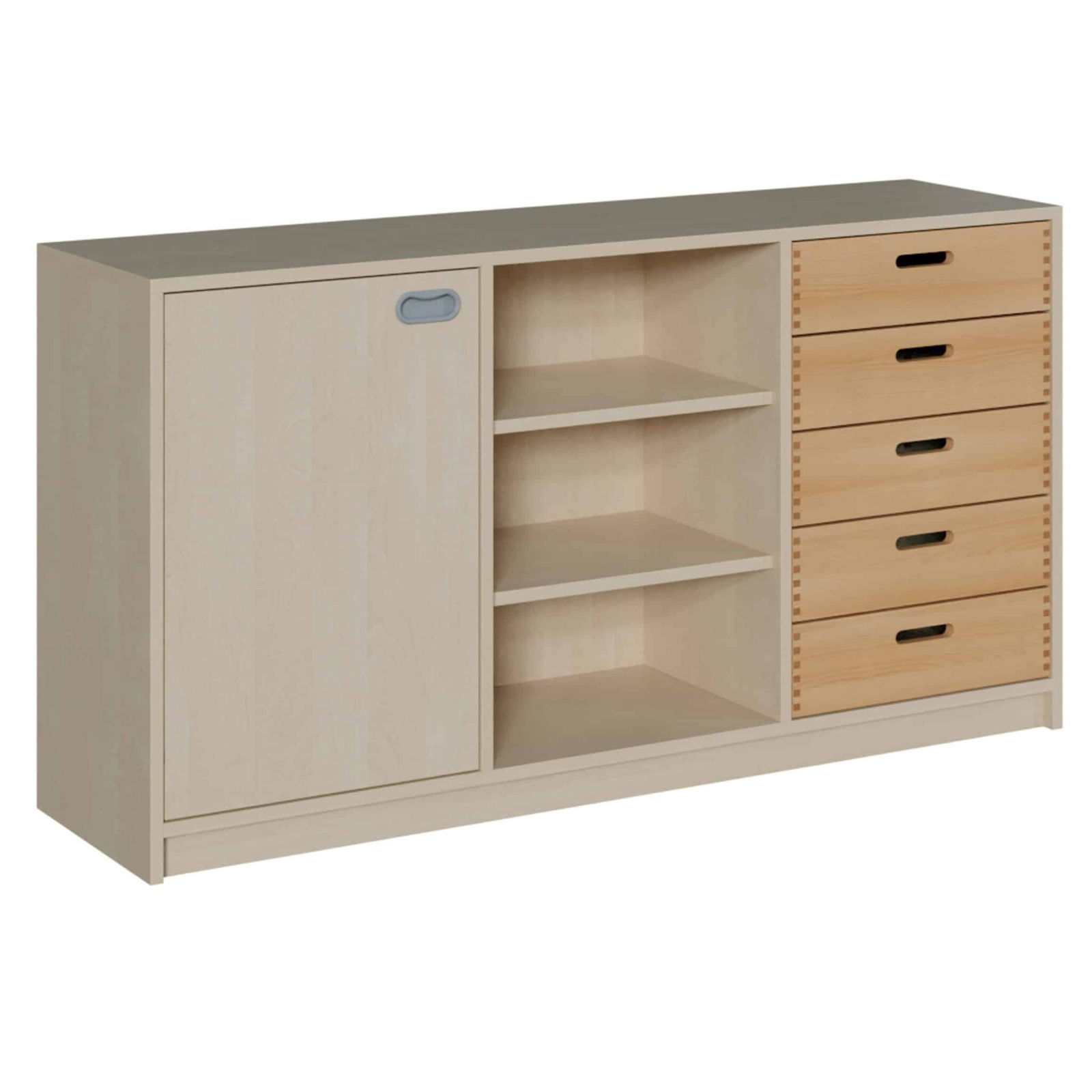 - Tür links, mittig Regal, rechts 5 Holzschübe