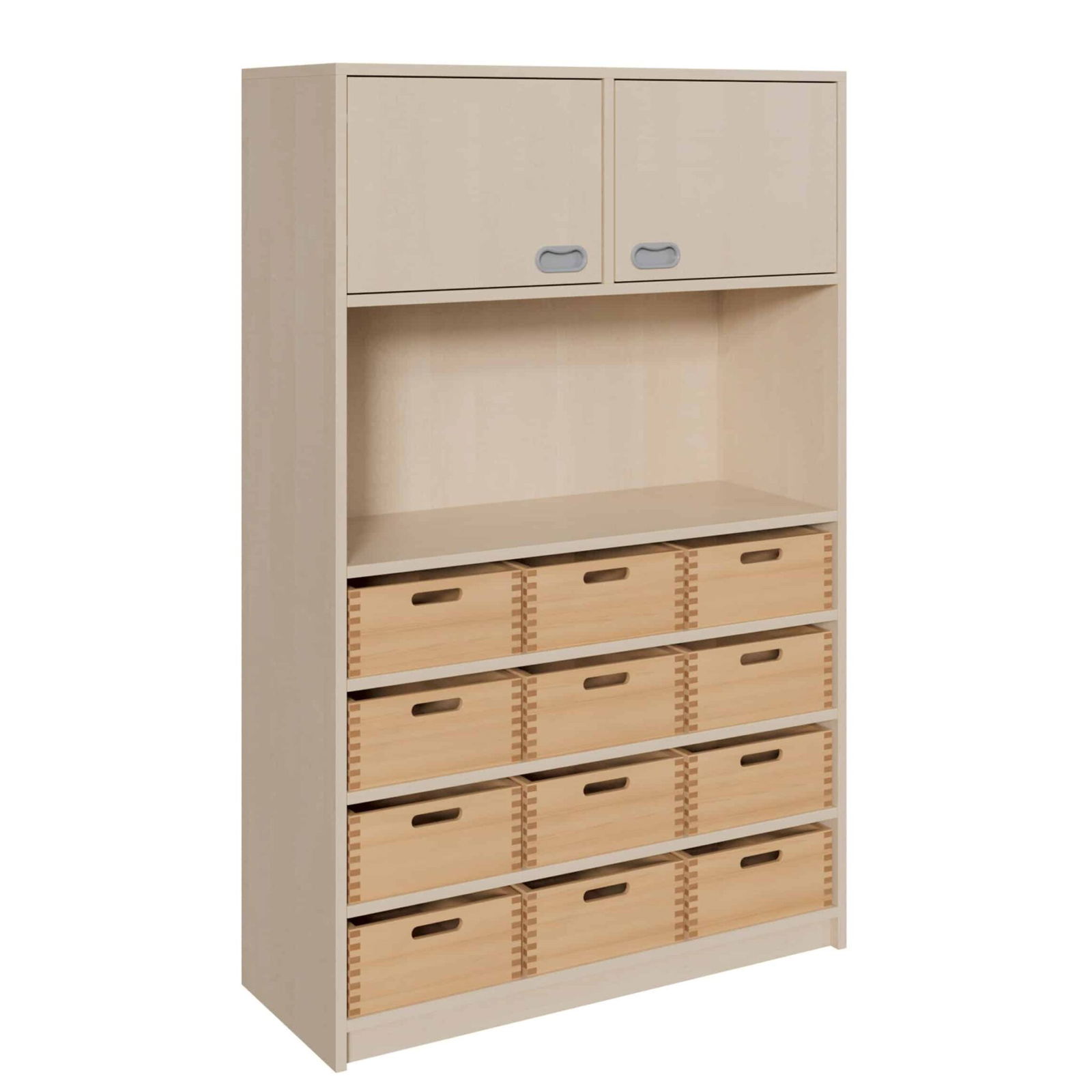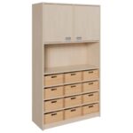 Schaffen Sie eine Umgebung, in der Ordnung und Kreativität Hand in Hand gehen. Unser Korpus-Schrank mit 12 großen Massivholzkästen und zwei Türen im oberen Bereich ist die ultimative Lösung für anspruchsvolle Aufbewahrungsbedürfnisse in Kitas, Schulen und anderen belebten Umgebungen. Dieses durchdachte Möbelstück kombiniert die Wärme und Langlebigkeit von Massivholz mit der Robustheit und Pflegeleichtigkeit moderner Korpuselemente. Während die 12 geräumigen Holzkästen ideal für Spielzeug, Bastelmaterialien und persönliche Gegenstände sind, bietet der geschlossene Bereich hinter den Türen diskreten Stauraum für Ordner, Bücher oder selten genutzte Materialien. So entsteht ein aufgeräumtes, strukturiertes und gleichzeitig einladendes Ambiente, das zum Lernen und Spielen anregt.