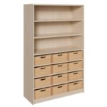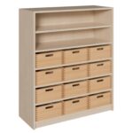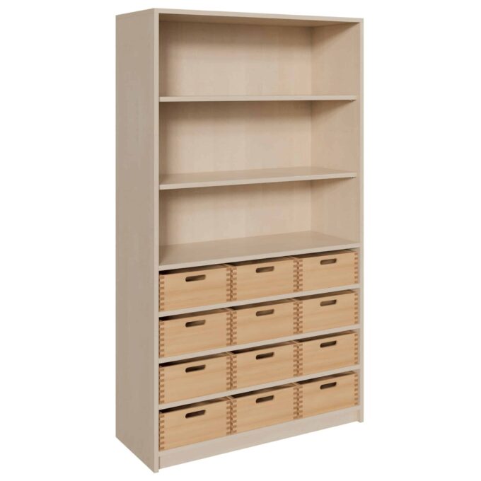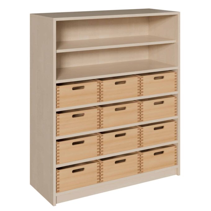 Verbinden Sie die Vorteile von strukturiertem Stauraum mit offener, zugänglicher Präsentationsfläche. Unser Korpus-Schrank mit 12 großen Massivholzkästen und einem praktischen Regalaufsatz ist die ideale Lösung für alle, die Ordnung lieben, aber gleichzeitig schnellen Zugriff auf wichtige Materialien benötigen. Dieses multifunktionale Möbelstück wurde für die hohen Anforderungen in Kitas, Schulen, Werkstätten und Büros entwickelt. Während die 12 robusten Holzkästen reichlich Platz für Spielzeug, Werkzeuge und lose Kleinteile bieten, eignen sich die offenen Regalfächer im oberen Bereich perfekt für Bücher, Ordner, fertige Kunstwerke oder Dekorationsgegenstände. Schaffen Sie eine Umgebung, die sowohl aufgeräumt als auch inspirierend ist.