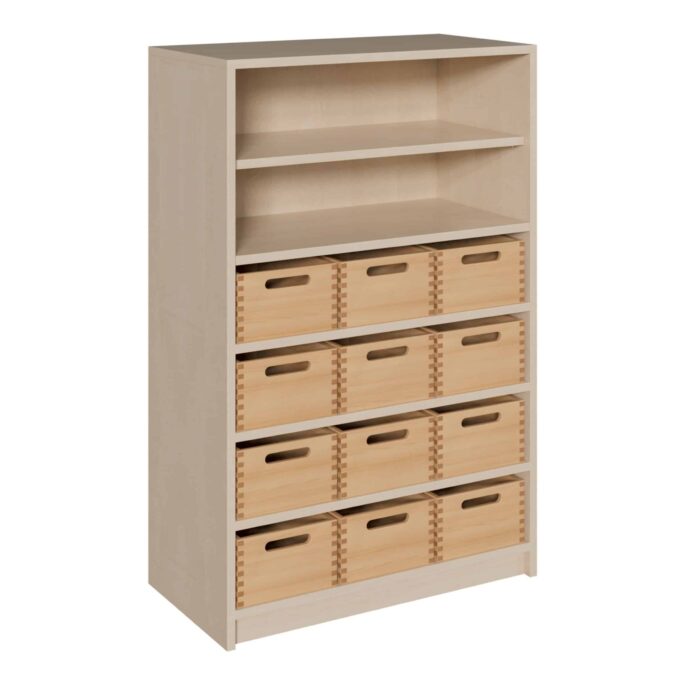 Erleben Sie die perfekte Symbiose aus platzsparendem Design und umfassender Organisation. Unser Korpus-Schrank mit 12 mittelhohen Massivholzkästen und einem offenen Regalaufsatz ist die ideale Lösung für alle, die auf schmalem Raum maximale Ordnung schaffen möchten. Mit einer Breite von nur 78 cm nutzt dieses Möbelstück die Höhe des Raumes optimal aus und kombiniert die Wärme von massivem Buchenholz mit der Funktionalität eines durchdachten Systems. Während in den 12 geräumigen Kästen Materialien und Utensilien übersichtlich verschwinden, bietet das obere Regal schnellen Zugriff auf Bücher, Ordner und Dekoratives. Ein wahres Multitalent für Klassenzimmer, Büros, Werkstätten oder Kreativräume.