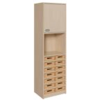Entdecken Sie das Potenzial von Nischen und schmalen Wänden mit unserem schlanken Korpus-Schrank. Ausgestattet mit 14 flachen Massivholzkästen und einem cleveren Aufsatz mit Tür, ist dieses Möbelstück die perfekte Lösung für Orte mit begrenztem Platzangebot. Es wurde speziell entwickelt, um eine Vielzahl kleinerer Gegenstände – von Stiften und Papier über Bastelmaterialien bis hin zu persönlichen Wertsachen – übersichtlich und systematisch zu verstauen. Während die 14 flachen Kästen eine unübertroffene Detailorganisation im unteren Bereich ermöglichen, bietet der geschlossene obere Teil mit einem verstellbaren Einlegeboden diskreten Stauraum für Ordner oder größere Utensilien. Dieses schmale Kraftpaket ist ideal für Klassenzimmer, Lehrerzimmer, Büros und Werkstätten, in denen jeder Zentimeter zählt.
