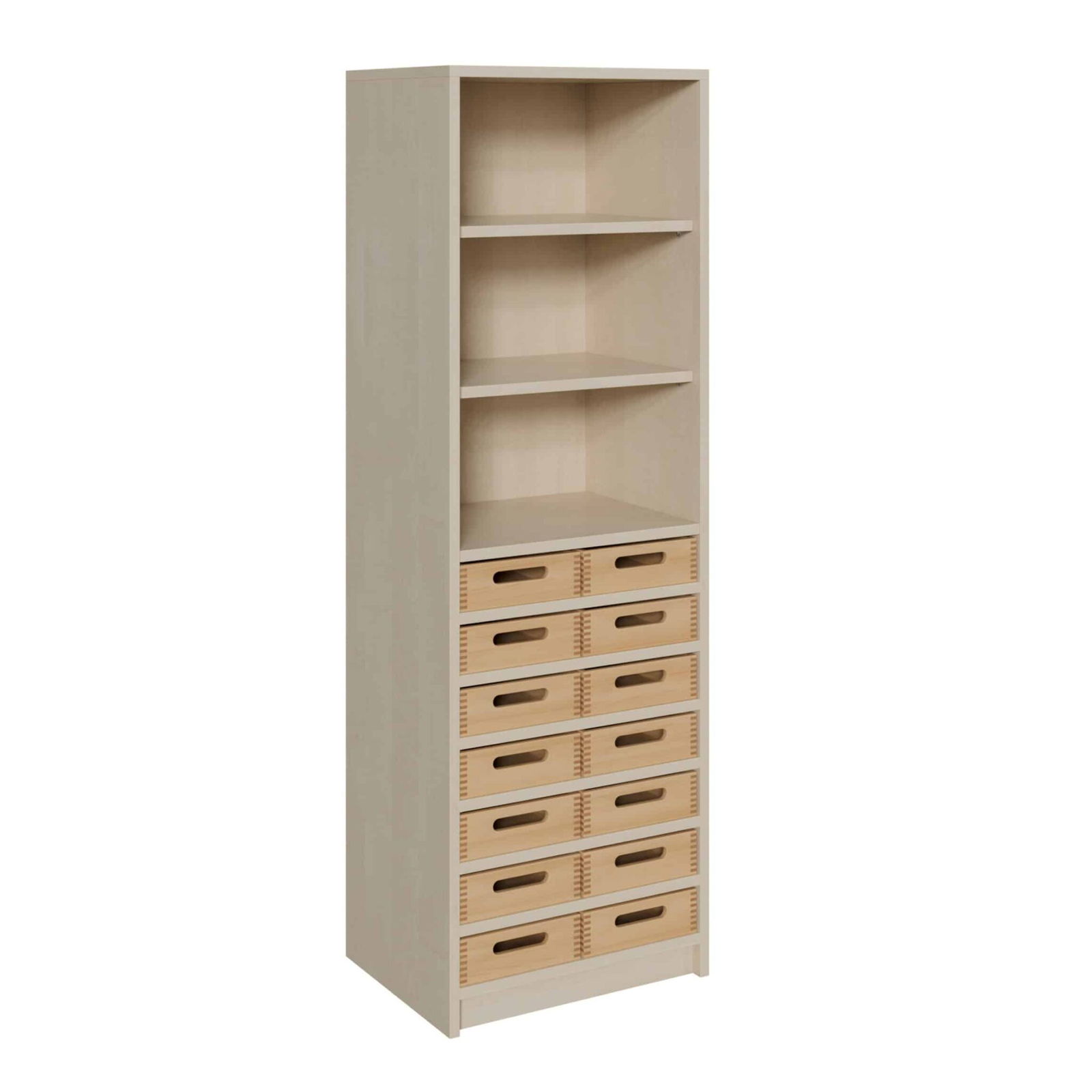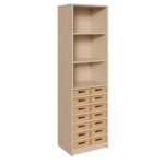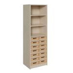 Nutzen Sie jeden Zentimeter Ihres Raumes optimal mit unserem schlanken Korpus-Schrank. Dieses hoch aufragende Organisationsgenie kombiniert 14 flache Massivholzkästen mit einem offenen Regalaufsatz und ist die perfekte Lösung für schmale Wände und ungenutzte Nischen. Ob im Klassenzimmer, im Lehrerzimmer, im Büro oder in der Werkstatt – dieses Möbelstück wurde entwickelt, um eine Fülle von Kleinteilen systematisch zu ordnen und gleichzeitig offenen Stauraum für schnell zugängliche Materialien zu bieten. Es vereint maximale Funktionalität auf minimaler Stellfläche und bringt durch die warmen Buchenholzkästen eine natürliche, einladende Atmosphäre in jeden Raum.