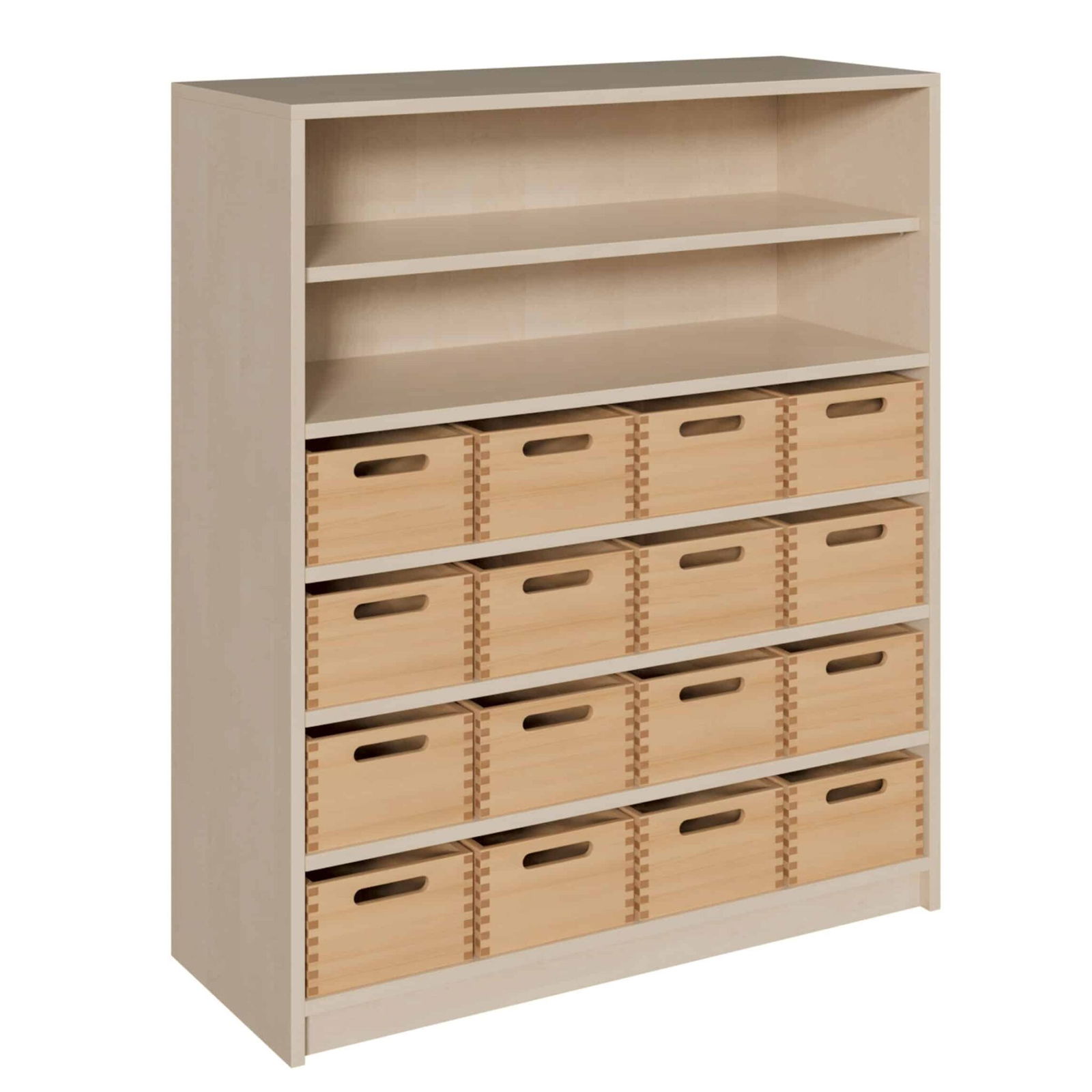 - Massivholzkästen: 16 mittelhohe Kästen aus Buche natur.