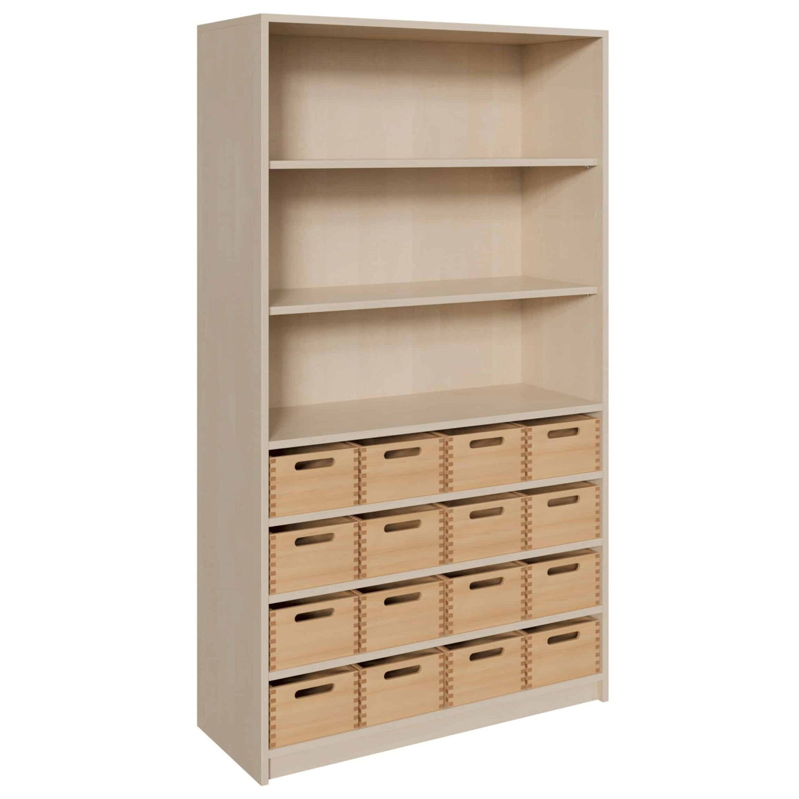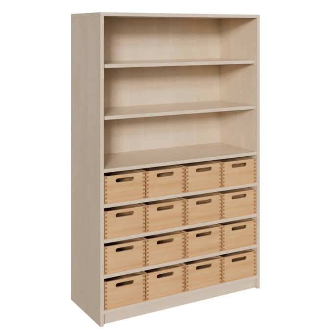 Stellen Sie sich einen Schrank vor, der die Robustheit eines Werkstattmöbels mit der intelligenten Aufteilung eines Archivsystems verbindet. Unser Korpus-Schrank mit 16 mittelhohen Massivholzkästen und einem offenen Regalaufsatz ist genau das: eine leistungsstarke Komplettlösung für Räume, in denen Ordnung und Übersichtlichkeit entscheidend sind. Dieses Möbelstück wurde für den intensiven Einsatz in Klassenzimmern, Kunsträumen, Werkstätten und Laboren entwickelt. Es kombiniert die Wärme und Haptik von 16 geräumigen Buchenholzkästen mit dem offenen, schnellen Zugriff auf Bücher, Ordner und größere Gegenstände im oberen Regalbereich.