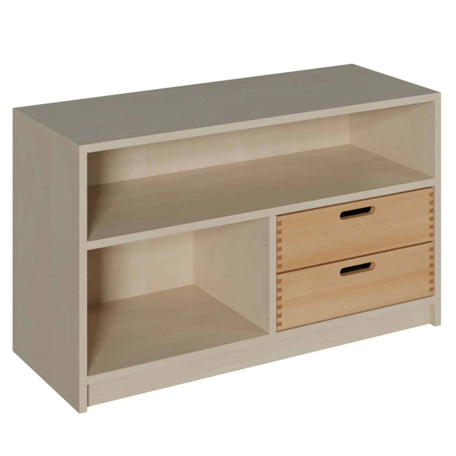 - Einheit 1: 2 Massivholzschübe (Buche) übereinander mit Griffmulde und integriertem Auszugstopp.