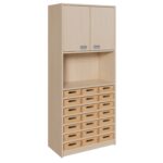 Entdecken Sie die perfekte Symbiose aus kleinteiliger Organisation und flexiblem Stauraum. Unser hoch aufragender Korpus-Schrank ist mit 21 flachen Massivholzkästen und einem cleveren Aufsatz mit Türen und Mittelwand ausgestattet. Er wurde speziell für Umgebungen entwickelt, in denen eine Vielzahl kleiner Gegenstände wie Stifte, Papiere, Bastelutensilien oder persönliche Eigentümer ordentlich und griffbereit aufbewahrt werden müssen. Während die 21 flachen Kästen eine unübertroffene Detailorganisation ermöglichen, bietet der obere Schrankbereich diskreten Platz für größere oder vertrauliche Materialien. Dieses Möbelstück ist die ideale Lösung für Kunsträume, Klassenzimmer, Büros und Werkstätten, die maximale Ordnung auf kompakter Grundfläche erfordern.