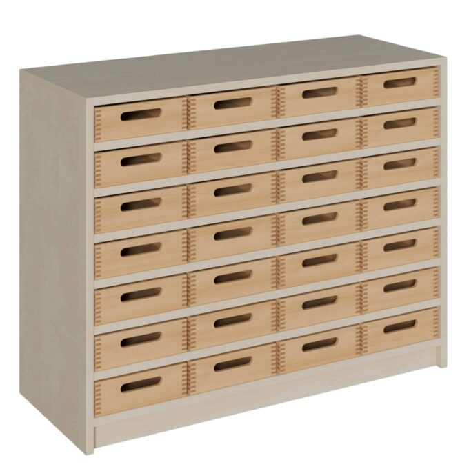 Stellen Sie sich einen Ort vor, an dem jedes kleine Detail seinen Platz hat. Unser Korpus-Schrank mit 28 flachen Massivholzkästen ist genau das: ein Meisterwerk der Organisation im praktischen Kommodenformat. Mit einer Höhe von 80 cm ist er die perfekte Lösung für Kunsträume, Klassenzimmer, Werkstätten und Labore, die eine maximale Sortiertiefe benötigen. Er kombiniert die unübertroffene Robustheit unserer Korpusmöbel mit der natürlichen Wärme von 28 Schubkästen aus massivem Buchenholz. Dieses Möbelstück verwandelt das Chaos unzähliger Kleinteile in ein klares, übersichtliches System und dient gleichzeitig als wertvolle Arbeits- und Ablagefläche in idealer Höhe.