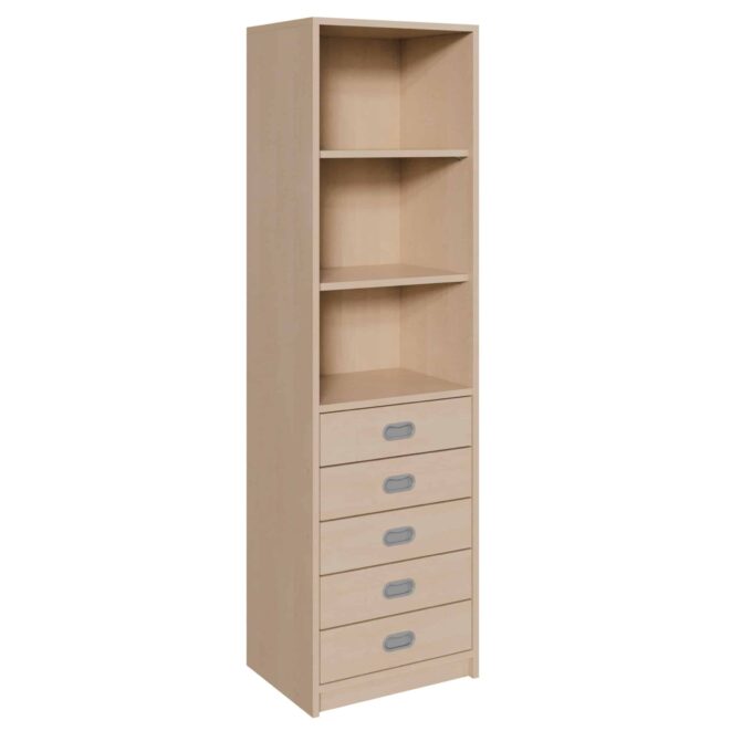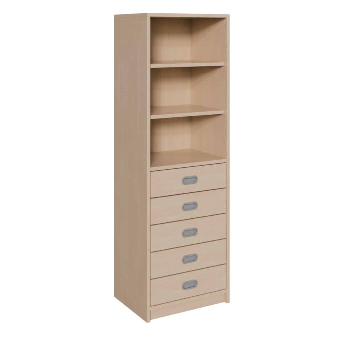 - Maximale Stauraumnutzung auf schmaler Grundfläche: Nutzen Sie ungenutzte Ecken und schmale Wandabschnitte optimal aus. Dieser Schrank bietet mit seinen fünf tiefen Schüben und dem aufgesetzten Regal erstaunlich viel Stauraum, ohne wertvolle Bodenfläche zu beanspruchen. Ideal für kompakte Büros oder volle Klassenzimmer.