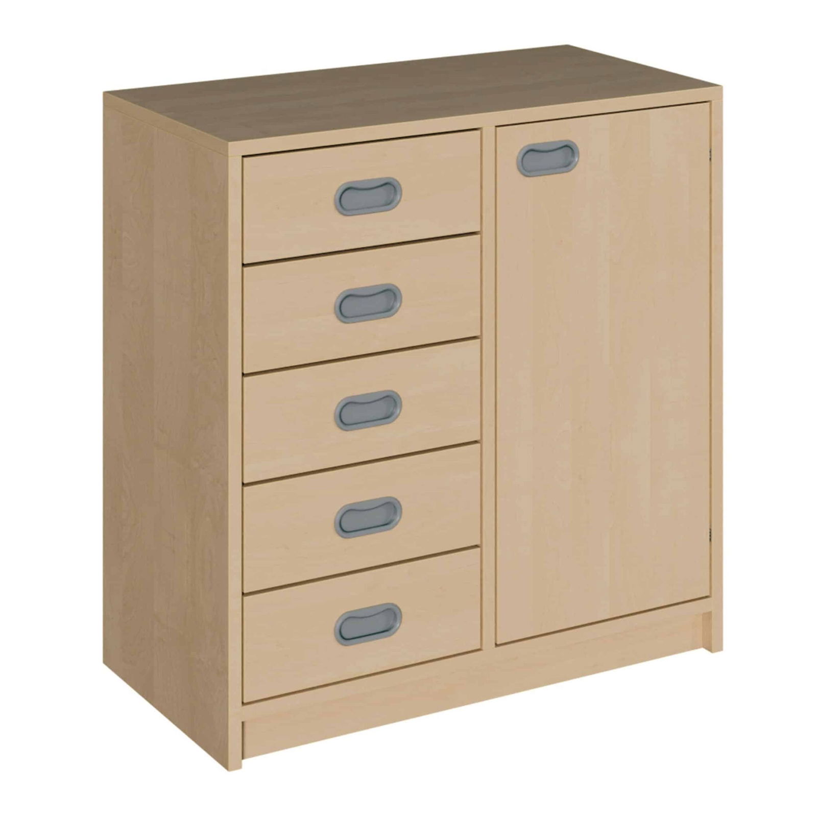 Entdecken Sie die perfekte Kombination aus Schubladen und Schrankfach in einer kompakten und vielseitigen Kommode. Dieses clevere Möbelstück wurde speziell für Umgebungen entwickelt, in denen sowohl schneller Zugriff als auch geschützter Stauraum gefragt sind. Mit fünf leichtgängigen Dekorblendenschüben auf der einen und einem geräumigen Türfach auf der anderen Seite bietet diese Kommode eine optimale Lösung für die Organisation in Kitas, Schulen oder Büros. Die kindgerechte Höhe von 80 cm macht sie zur idealen Wickelkommoden-Ergänzung, zur Spielzeugstation oder zur praktischen Anrichte, deren Oberfläche als zusätzliche Arbeits- oder Ablagefläche dient.