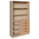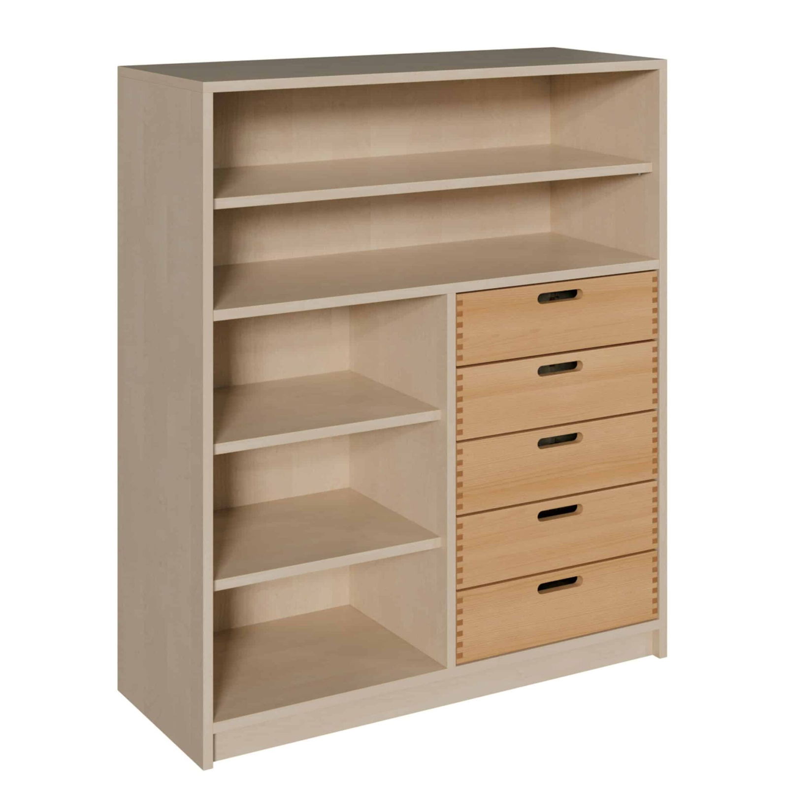 • Asymmetrisches Design für dynamische Organisation: Die einzigartige Anordnung macht diesen Schrank besonders vielseitig. Fünf Massivholzschübe bieten perfekten Platz für die Feinsortierung von Kleinteilen. Daneben und darüber schaffen offene Regalfächer mit verstellbaren Böden Raum für Bücher, Ordner und Materialien, die stets griffbereit sein müssen.