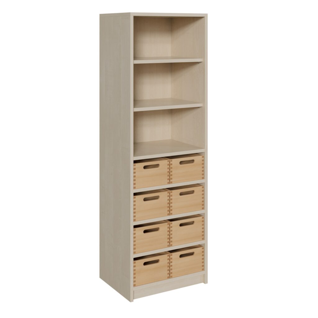 Maximieren Sie Ihren Stauraum, ohne wertvolle Bodenfläche zu opfern. Unser schmaler Korpus-Schrank ist ein wahres Raumwunder, das auf einer Breite von nur 52 cm eine beeindruckende Organisationslösung bietet. Er kombiniert acht mittelhohe Massivholzkästen mit einem praktischen, offenen Regalaufsatz. Dieses Möbelstück wurde speziell dafür entwickelt, ungenutzte Ecken und schmale Wandabschnitte in hochfunktionale Ordnungszentren zu verwandeln. Es ist die perfekte Wahl für Klassenzimmer, Büros, Werkstätten oder Flure, in denen jeder Zentimeter zählt. Die Kombination aus geschütztem Stauraum und schnellem Zugriff macht diesen Schrank zu einem unverzichtbaren Helfer im Alltag.