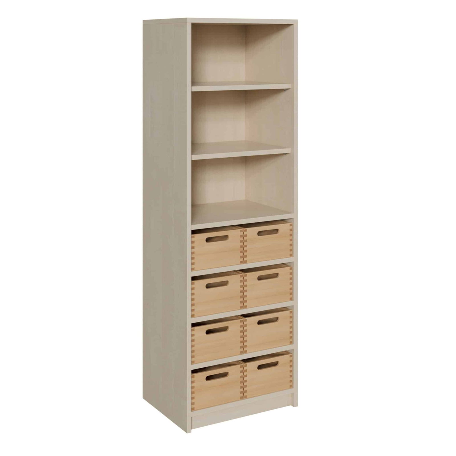 - Oberer Teil: Offenes Regal mit verstellbaren Einlegeböden.