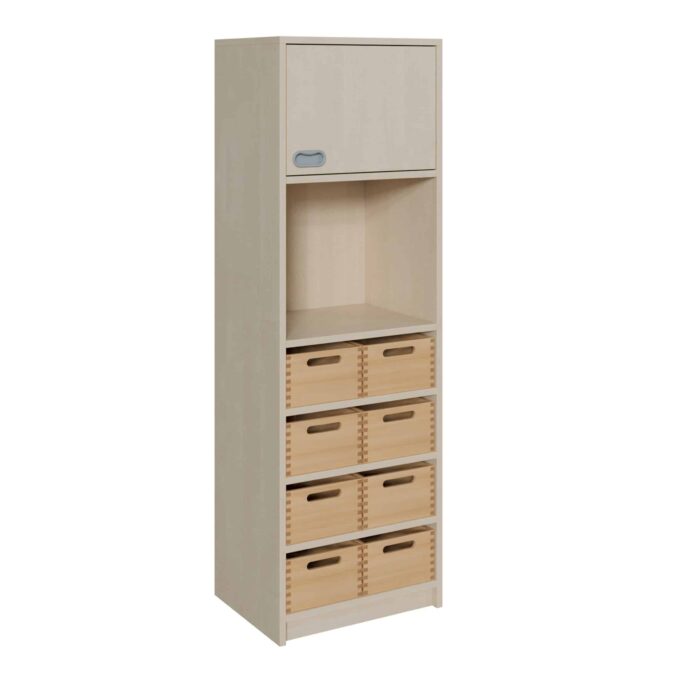 - BxHxT: 52x160x40 cm, unten 8 Kästen, oben 1 Tür (links oder rechts).