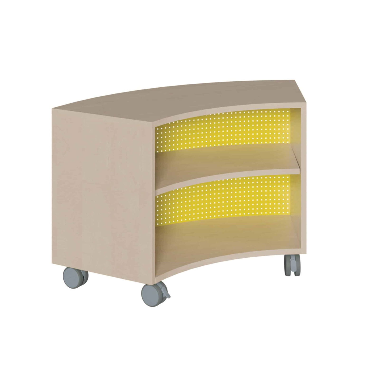 Bringen Sie Bewegung, Farbe und endlose Flexibilität in Ihre Räume! Unser fahrbares Bogenregal ist mehr als nur Stauraum – es ist ein kreatives Werkzeug zur dynamischen Raumgestaltung. Basierend auf einer eleganten Sechstelkreis-Form, ermöglicht dieses mobile Regal die Schaffung von geschwungenen Linien, einladenden Nischen oder sogar ganzen Kreisen. Die farbenfrohe, magnetische Lochblech-Rückwand dient gleichzeitig als attraktive Präsentationsfläche. Ob als einzelner Akzent, als verspielter Raumteiler oder in Kombination mit weiteren Elementen – dieses Regal passt sich jeder pädagogischen Situation an und verwandelt starre Raumkonzepte in lebendige Lernlandschaften.