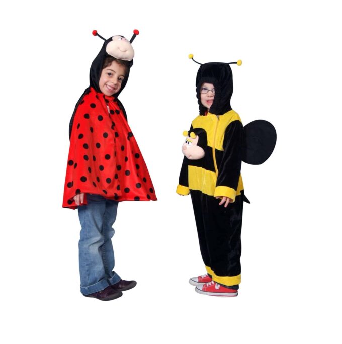 Das Set A besteht aus einem Kostümanzug Biene und einen Umhang Marienkäfer. Waschbar bei 30°C.