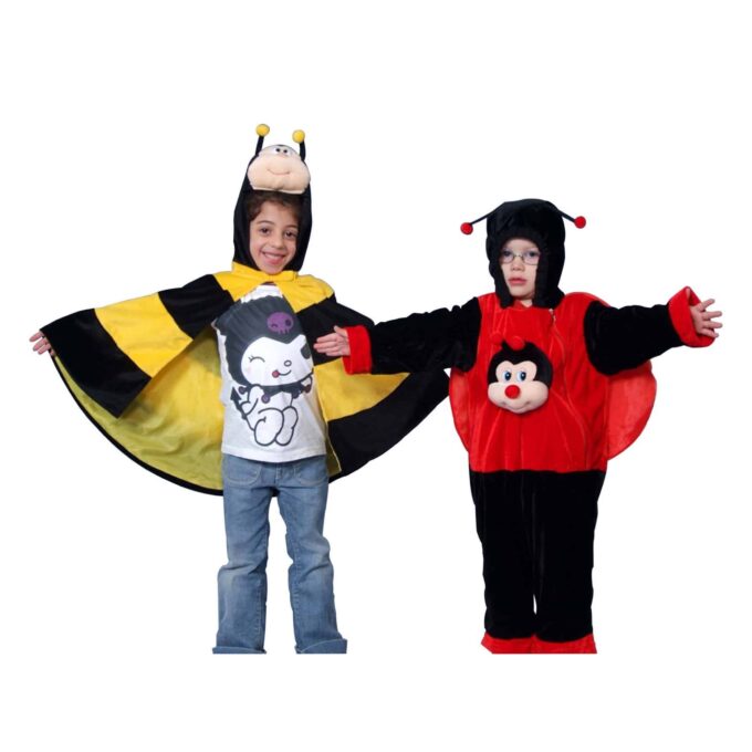 Das Set A besteht aus einem Kostümanzug Marienkäfer und einen Umhang Biene. Waschbar bei 30°C.