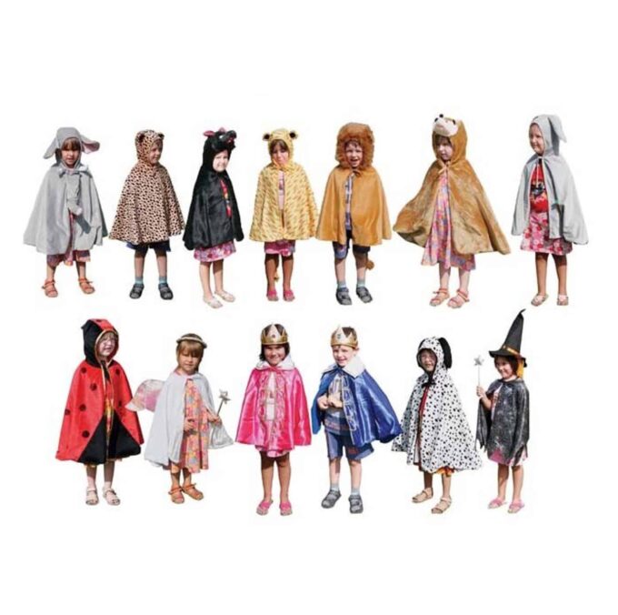 Das Set beinhaltet folgende Kostüme: Elefant, Leopard, Wolf, Tiger, Löwe, Bär, Hase, Marienkäfer, Engel, Königin, König, Dalmatiner und Zauberer (Hexe). Waschbar bei 30 Grad