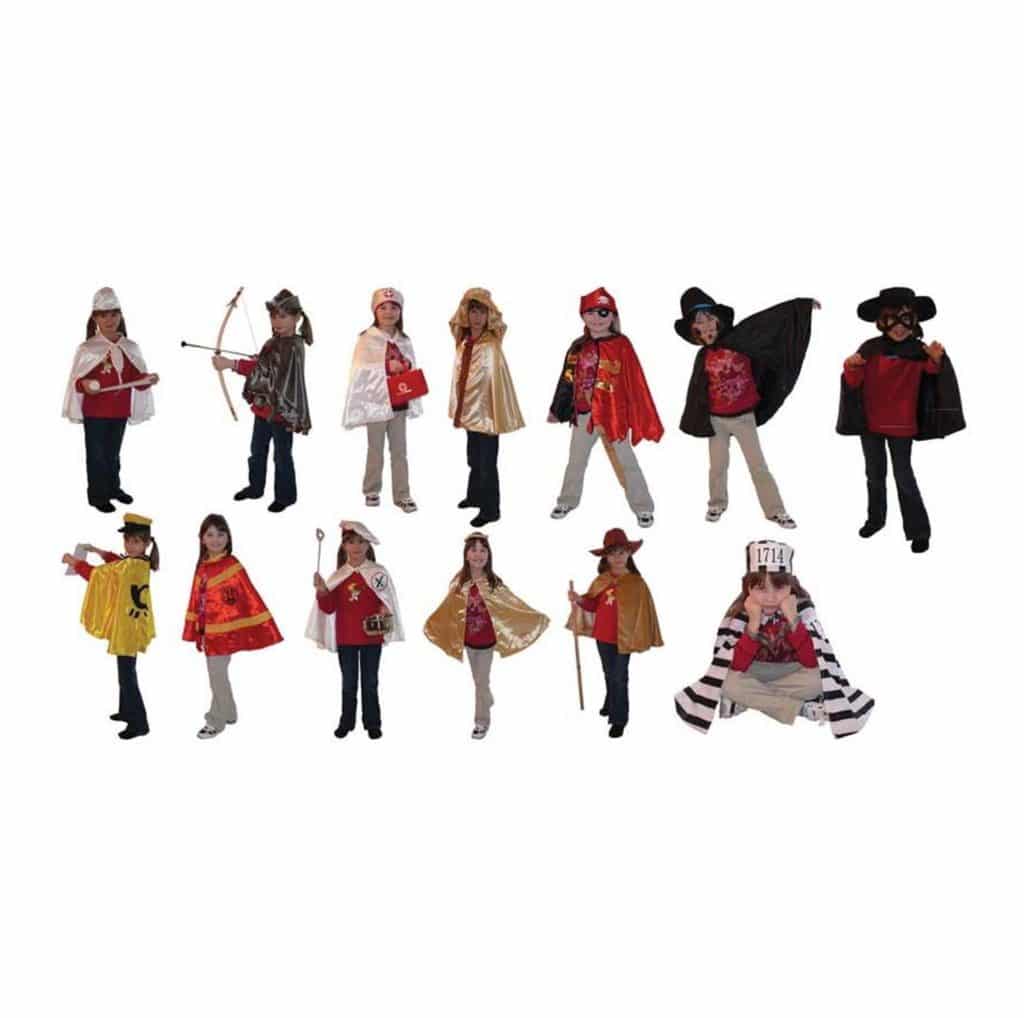Das Set beinhaltet folgende Kostüme: Arzt/Ärztin, Jäger, Krankenschwester/Pfleger, Scheich, Pirat, Schornsteingfeger, Räuber, Postbote, Feuerwehr, Koch, Prinzessin, Hirte und Gefangener. Waschbar bei 30 Grad