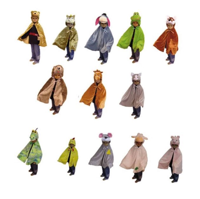 Das Set beinhaltet folgende Kostüme: Esel, Frosch, Maus, Schaf, Bär, Küken, Eichhörnchen, Dinosaurier, Kamel, Igel, Katze, Fuchs und Schwein. Waschbar bei 30 Grad
