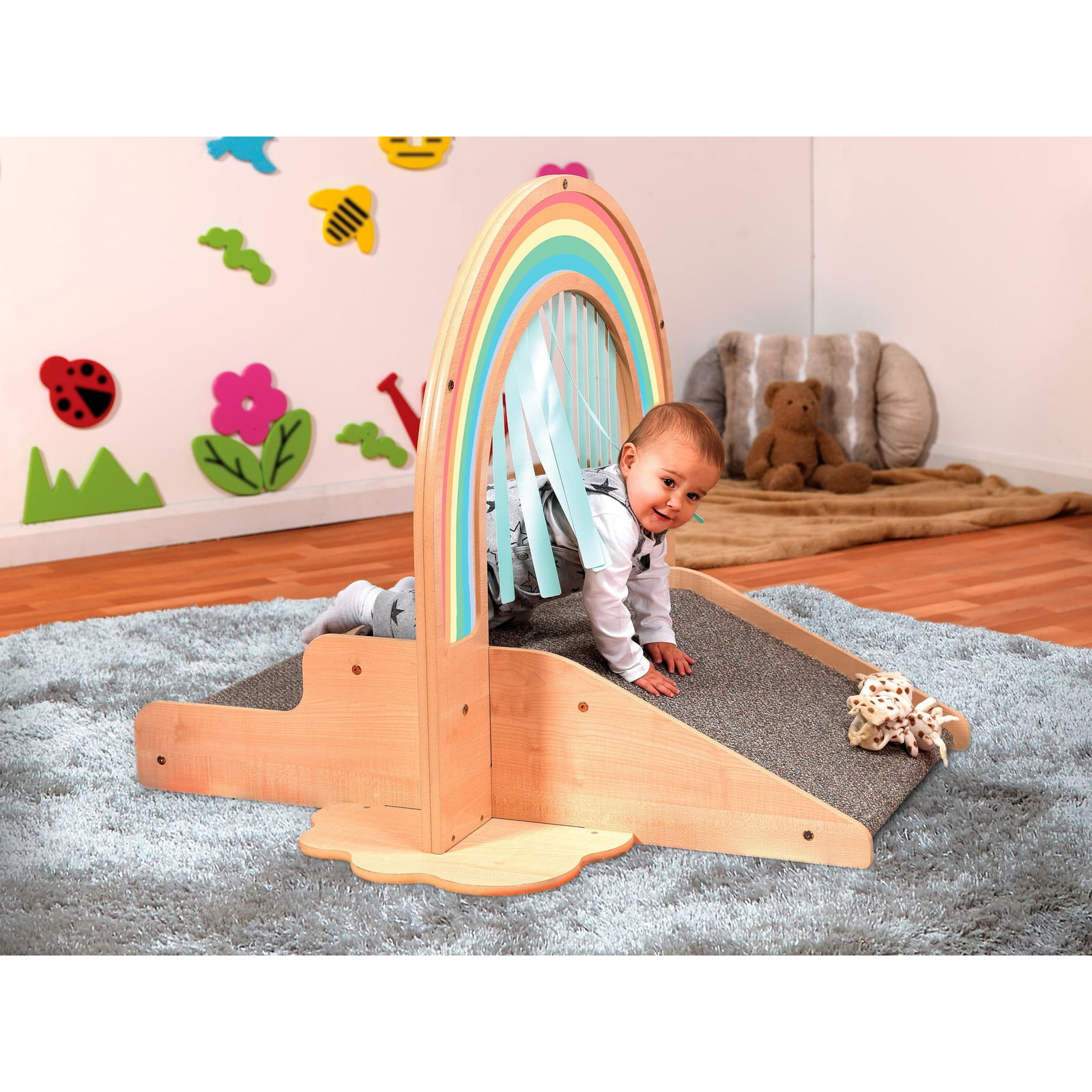 - Sensorische Anreize: Der große, farbenfrohe Regenbogen weckt die Neugier und regt die Sinne an. Er dient als visueller Fixpunkt und inspiriert zu fantasievollen Spielen wie dem Durchkrabbeln eines Tunnels.
