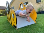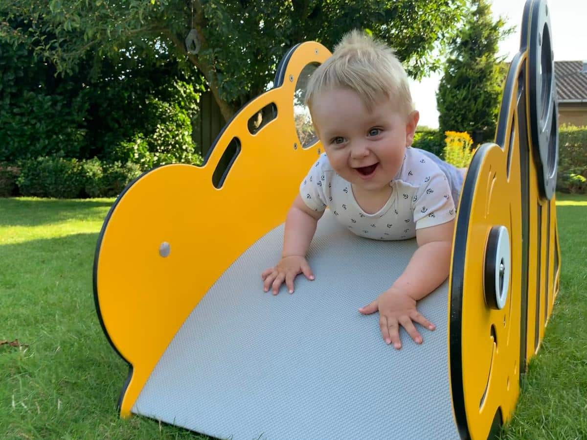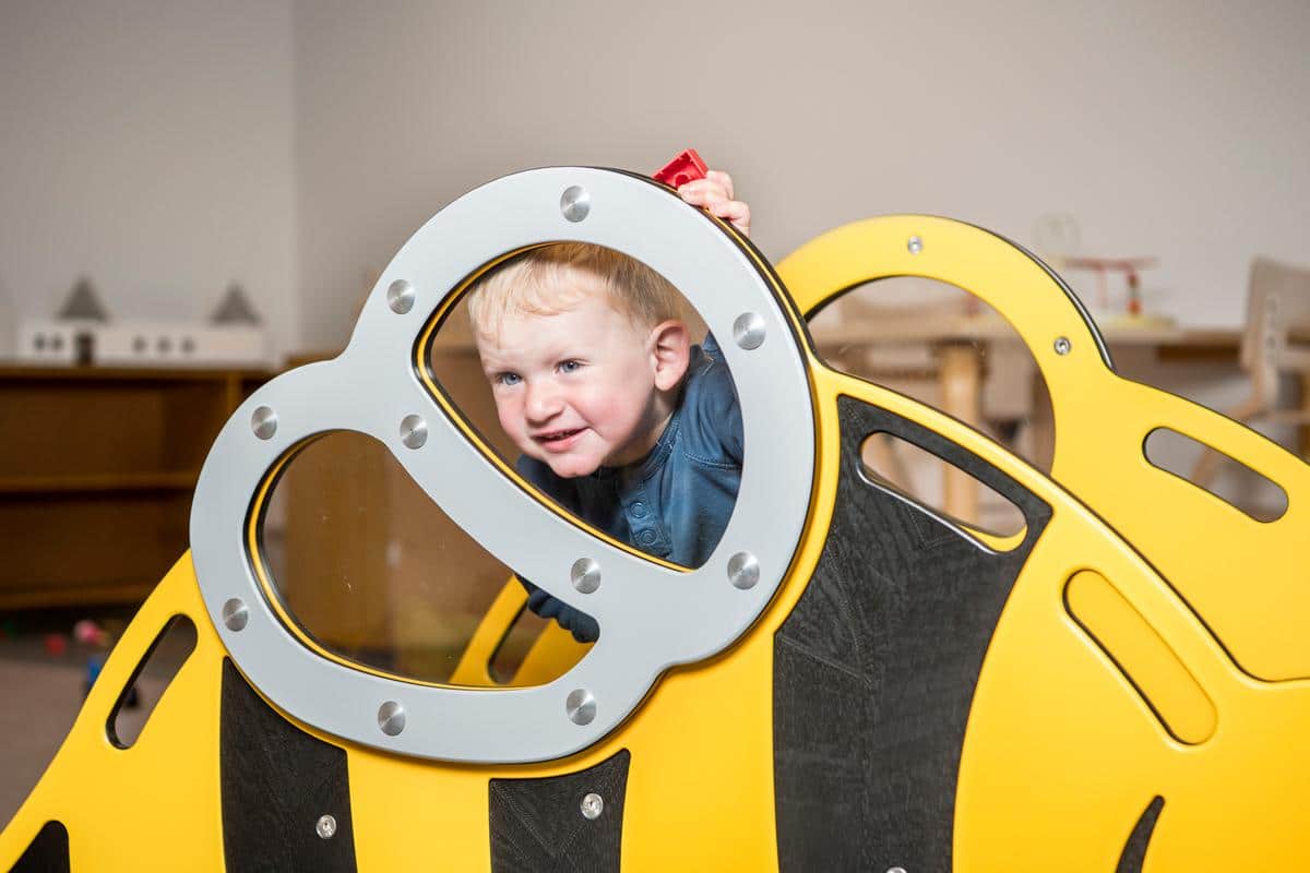 Die Krabbelbrücke „Biene Brumm“ ist speziell für Kleinkinder gedacht, die gerade Krabbeln, Stehen und Gehen lernen. Biene Brumm beschert selbst den Kleinsten mehrere Festhaltemöglichkeiten, sodass sie sich hochziehen können, während sie üben, die Balance zu halten. Der speziell entwickelte Boden mit würfelförmiger Struktur („cubic grain“) bietet selbst den kleinsten Füßen rutschfesten Halt. Die Flügel von Biene Brumm bestehen aus durchsichtigem Polycarbonat, sodass Kinder selbst beim Krabbeln ihre Umgebung bequem im Auge behalten können.