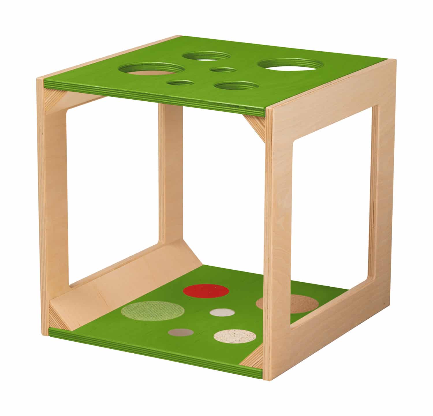 - Spielfunktionen: Haptische Materialien, Fenster-, Fädel- und Grifflöcher
