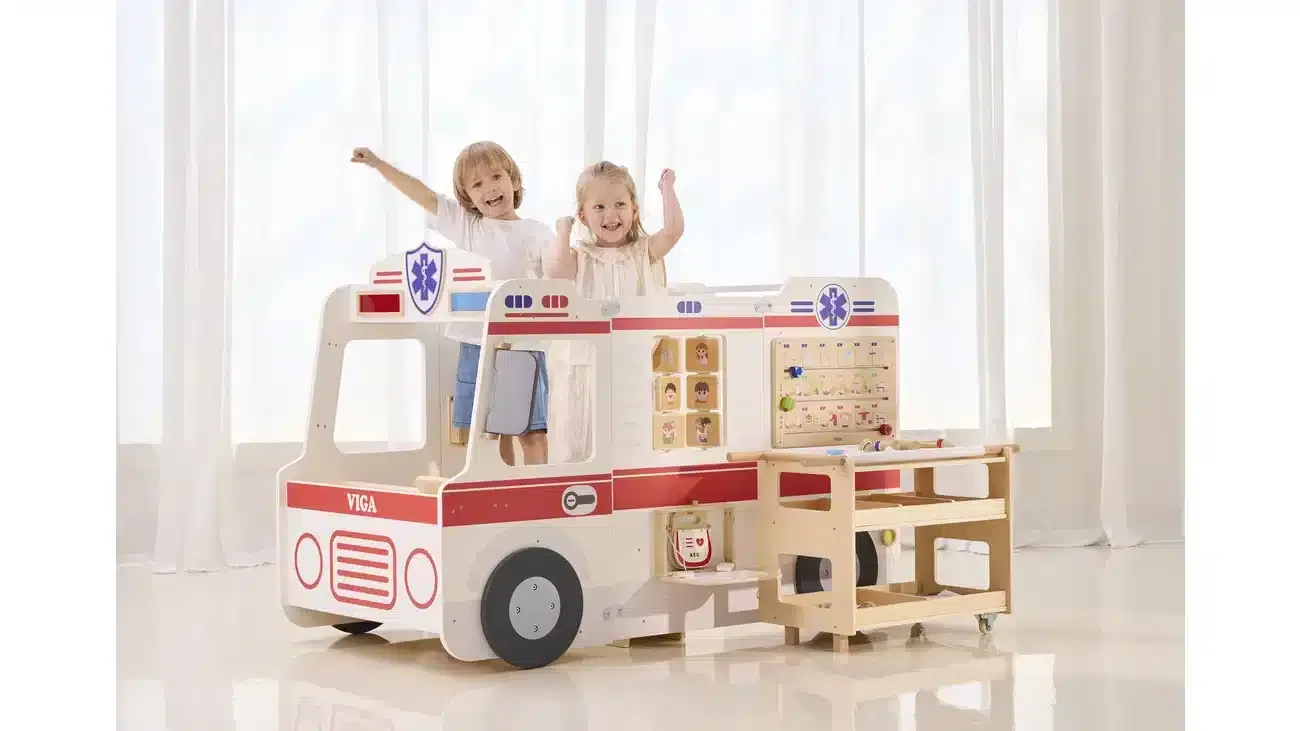 Mit dem Spielhaus Krankenwagen können Kinder realistische Szenarien nachspielen. Ob als Fahrer am Steuer, beim Annehmen von Notrufen am Holztelefon oder als Sanitäter, der Verletzte versorgt – jede Rolle ist entscheidend, um Menschenleben zu retten! Ihre Lieblingsteddys oder Puppen können auf der mitgelieferten Trage mit Rädern schnell in Sicherheit gebracht werden.