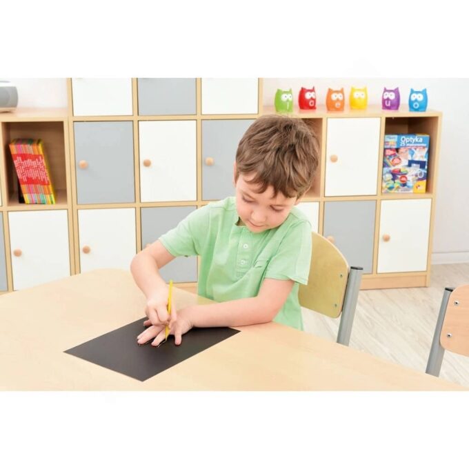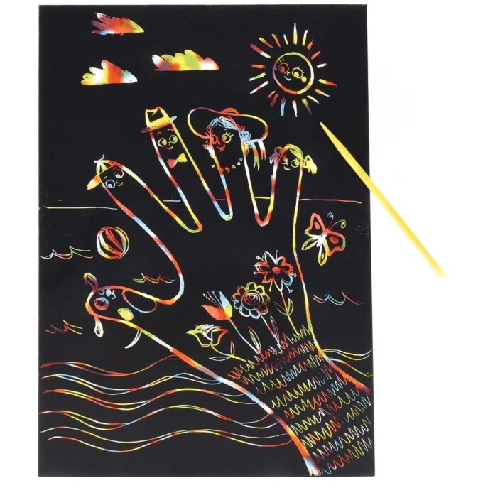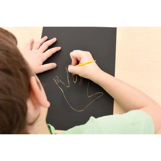 Die Anwendung ist kinderleicht: Malen Sie ein Blatt Papier mit Wachsmalstiften in verschiedenen Farben, bis das gesamte Blatt überzogen ist. Anschließend tragen Sie die Deckfarbe auf, die die bunten Motive hinter einem schwarzen Vorhang versteckt. Nach dem Trocknen können die kreativen Designs mit einem Kratzstäbchen wieder freigelegt werden – so entstehen auf spielerische Art und Weise farbenfrohe Kunstwerke!