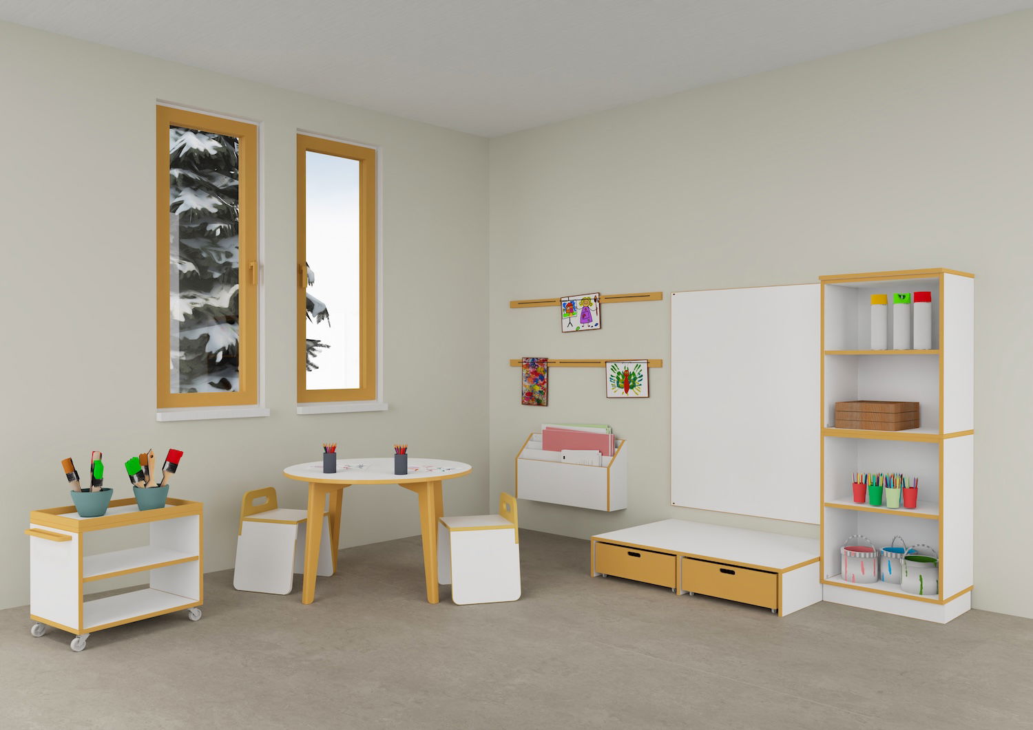 Dieses Set ist eine komplette Lösung, die Arbeitsflächen, Stauraum und Präsentationsmöglichkeiten harmonisch vereint. Am runden Tisch können Kinder gemeinsam malen und basteln, während der mobile Materialwagen Stifte, Pinsel und Farben direkt zur Hand rollt. Großformatige Kunstwerke entstehen am Whiteboard, und das Wandregal hält Papiervorräte übersichtlich bereit. Zusätzlicher Stauraum in Regalen und Rollkisten sorgt dafür, dass die Werkstatt stets aufgeräumt bleibt. Die fertigen Meisterwerke finden schließlich an den Bilderleisten ihren Ehrenplatz.