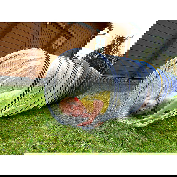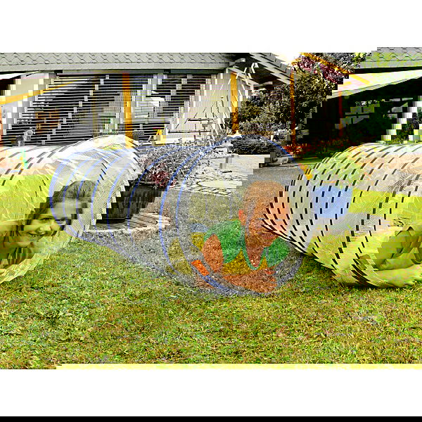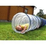 Angstfrei krabbeln Kinder durch diesen lichtdurchfluteten Kriechtunnel. Der robuste Gewebeplanenstoff lässt keine Feuchtigkeit von nassem Gras durch. Innenliegende Metallspirale. Durch zwei Klettlaschen ist er schnell wieder platzsparend aufgeräumt (ca. 6 cm breit). Farbe: transparent, blau.