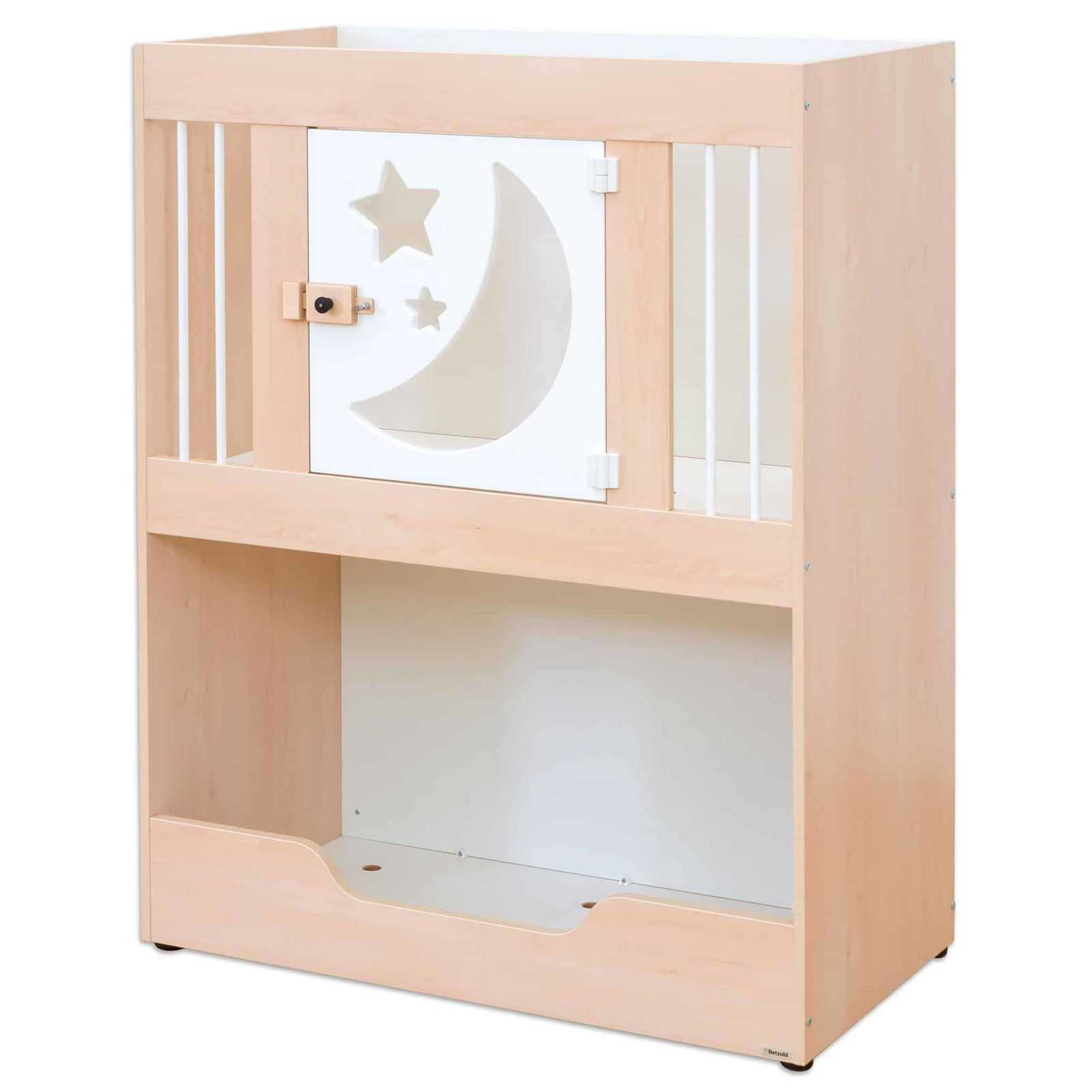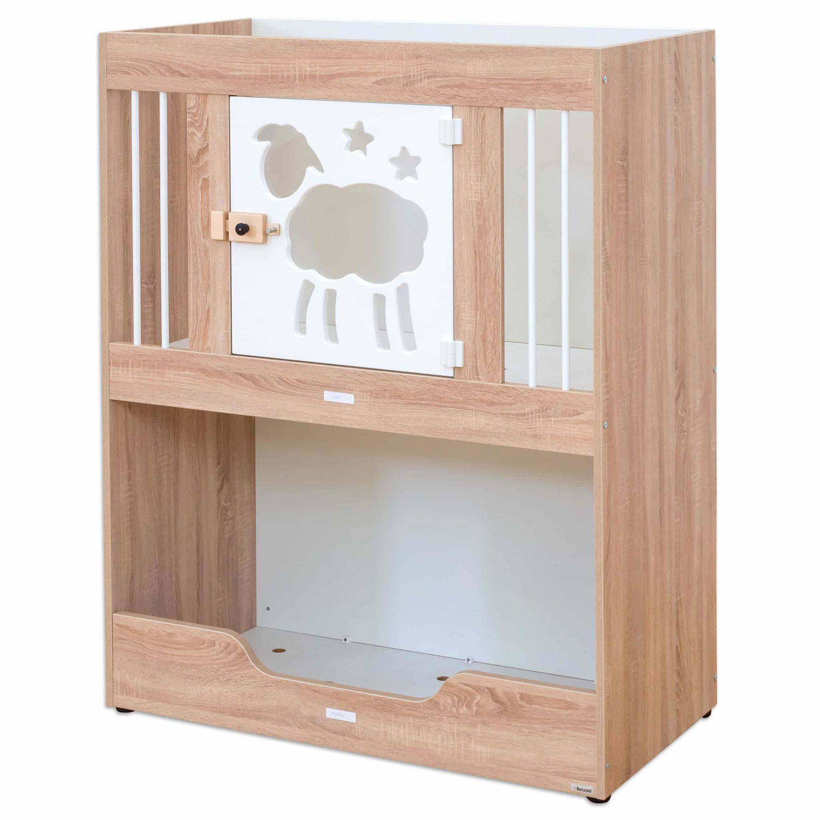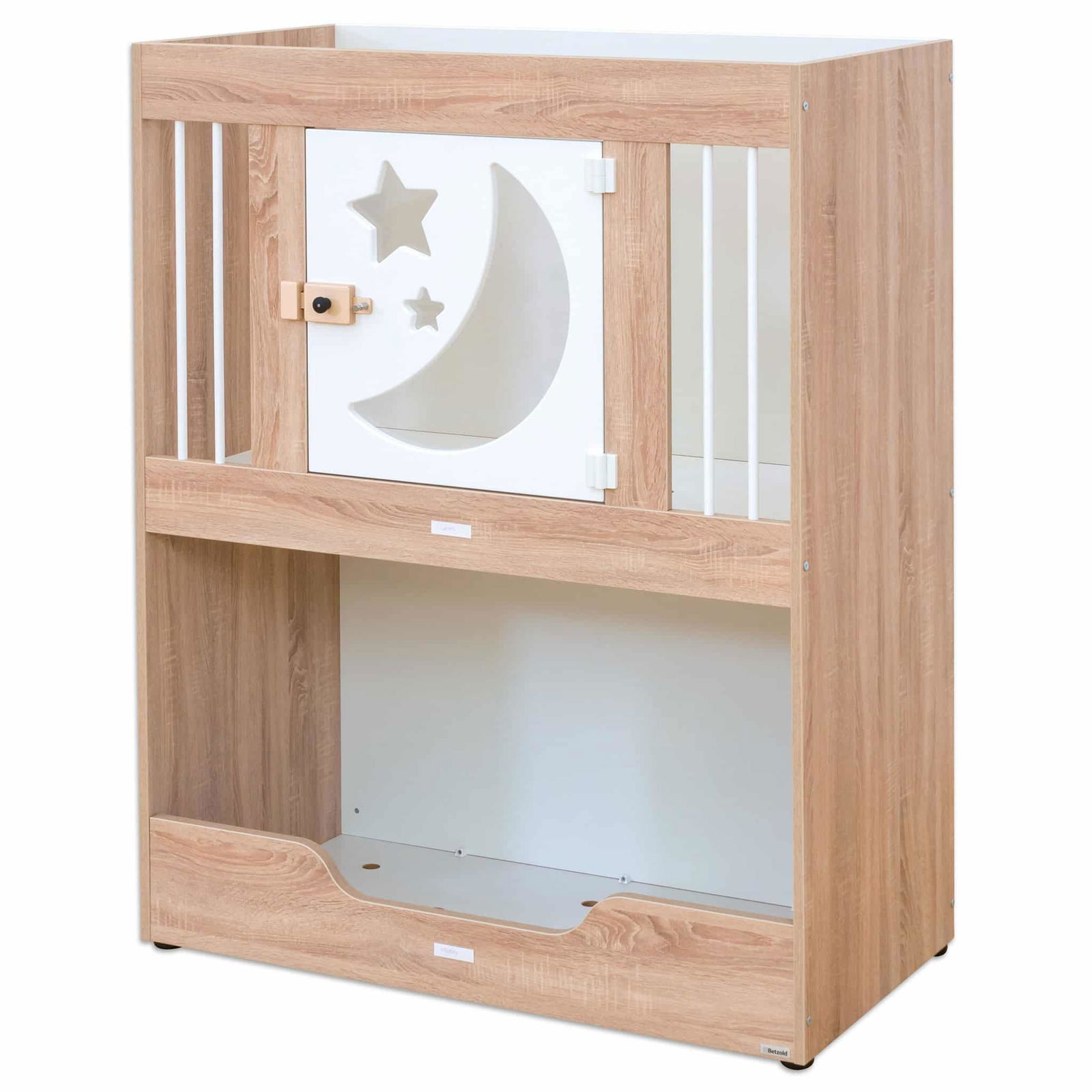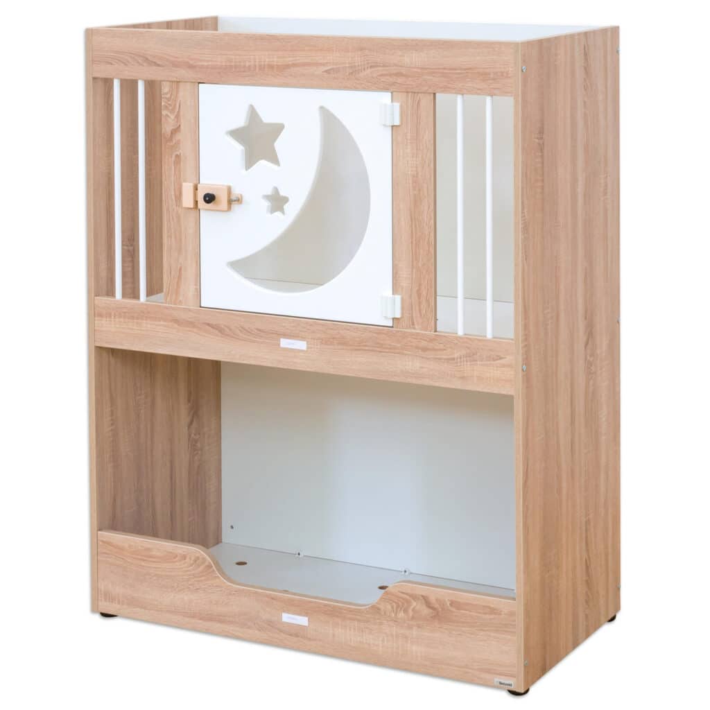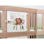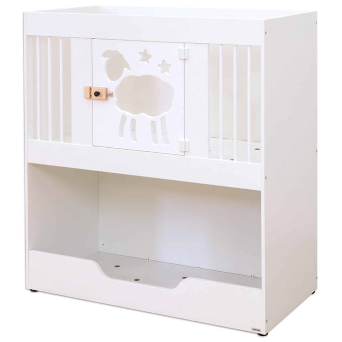 - Kindgerechte Türdetails: Die liebevoll designte, weiß lackierte Tür kann wahlweise mit Schäfchen oder Mond- und Sternmotiven gestaltet werden und bietet einen transparenten Acrylglaseinsatz für mehr Sichtkontakt.