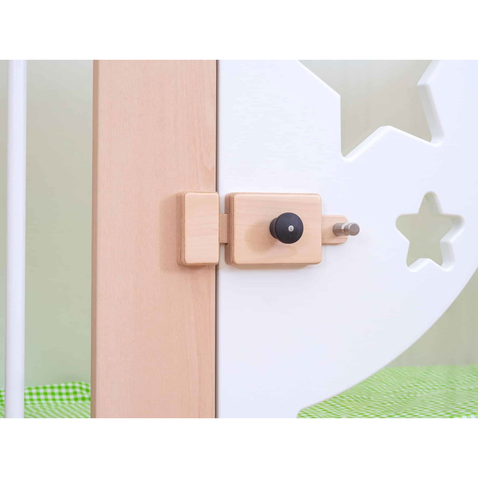 - Sichere Verriegelung: Mit dem innovativen Türmechanismus ist die obere Etage nur von außen zu öffnen. Der Türknauf löst die Blockade, bevor der Türriegel aufgeschoben wird – ein Plus an Sicherheit für die Kleinen.