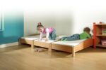 - Effiziente Raumnutzung: Nutzen Sie Ihre Räumlichkeiten optimal aus. Anstatt separate, feste Betten aufzustellen, die permanent Platz beanspruchen, bietet dieses System eine bedarfsgerechte Lösung, die sich perfekt an den dynamischen Kita-Alltag anpasst.