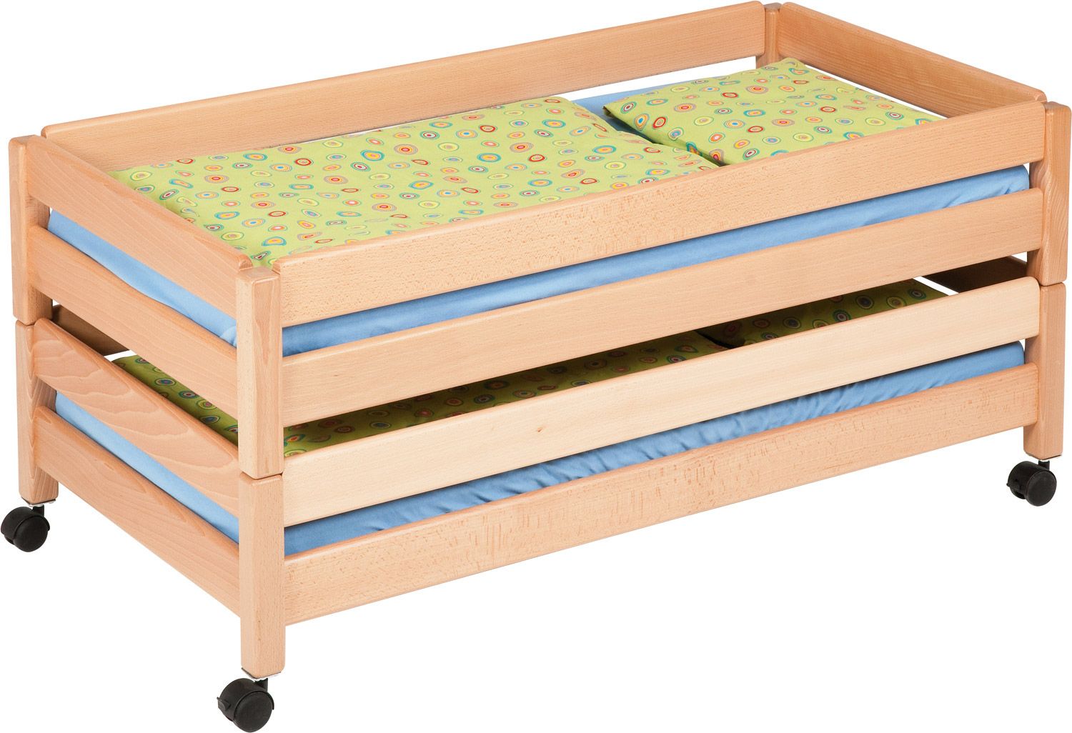 Die Krippenstapelliege ist ohne Rollen stapelbar und erlaubt eine platzsparende Aufbewahrung von bis zu 10 Stück. Dies ist besonders praktisch in Einrichtungen mit begrenztem Raum.