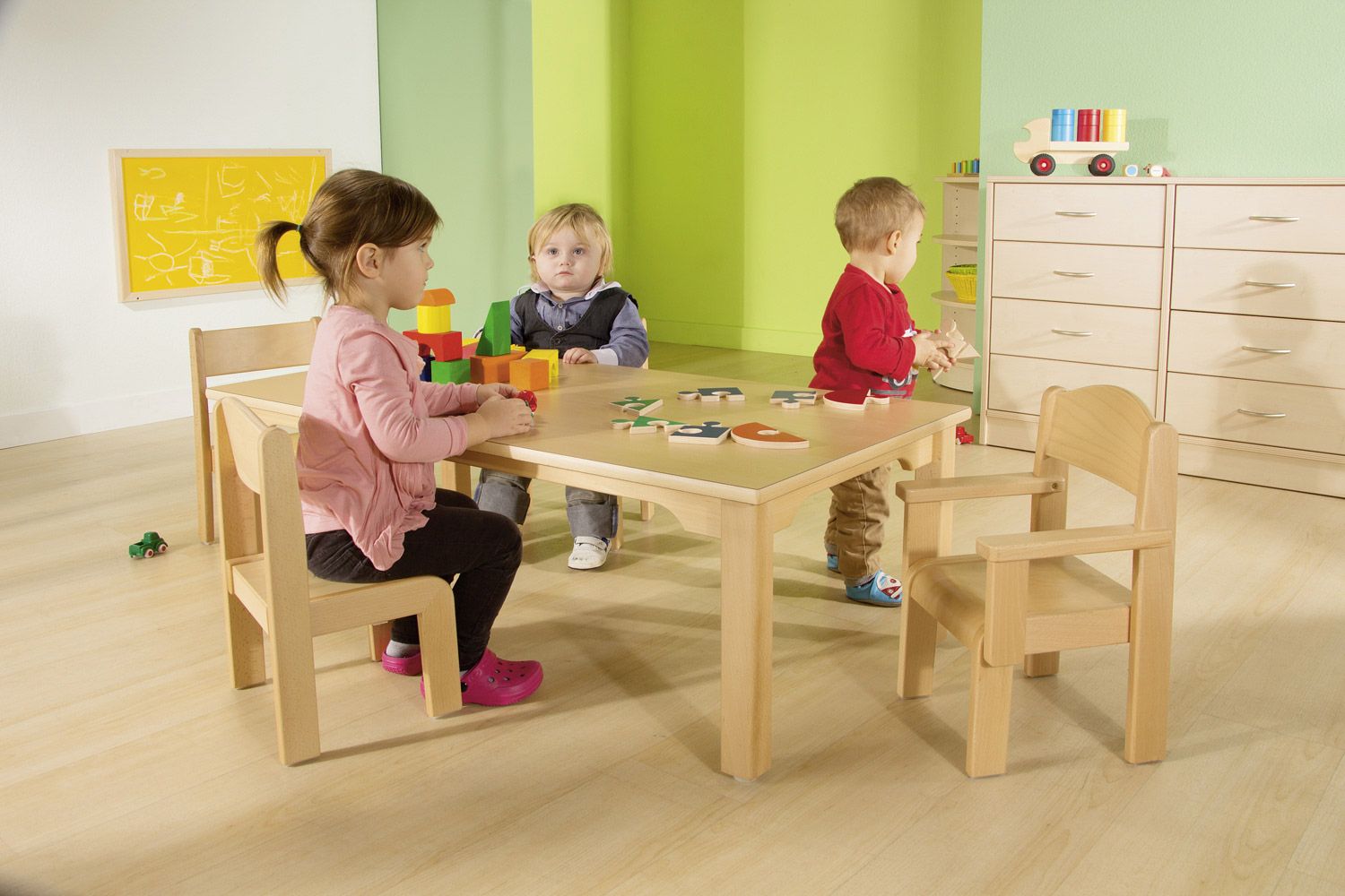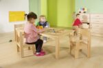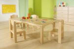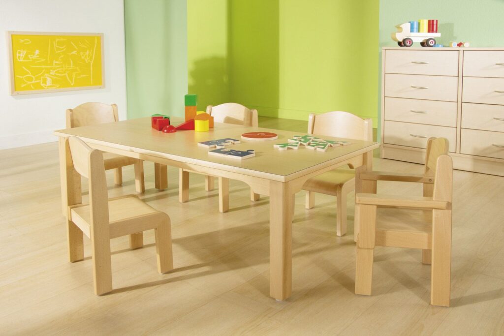 Diese hochwertige Tischgruppe besteht aus einem rechteckigen Tisch und sechs stabilen Stühlen. Der Tisch bietet eine großzügige Arbeitsfläche, die optimal auf die Bedürfnisse von Kleinkindern abgestimmt ist. Die beiden Stühle mit Armlehnen sorgen für zusätzlichen Halt und Komfort, während die vier weiteren Stühle eine stabile Sitzgelegenheit bieten. Das naturbelassene Design fügt sich harmonisch in jede Umgebung ein und schafft eine warme und einladende Atmosphäre.